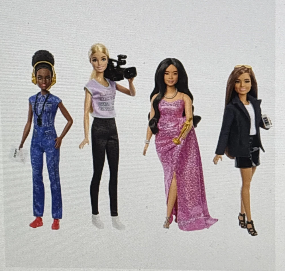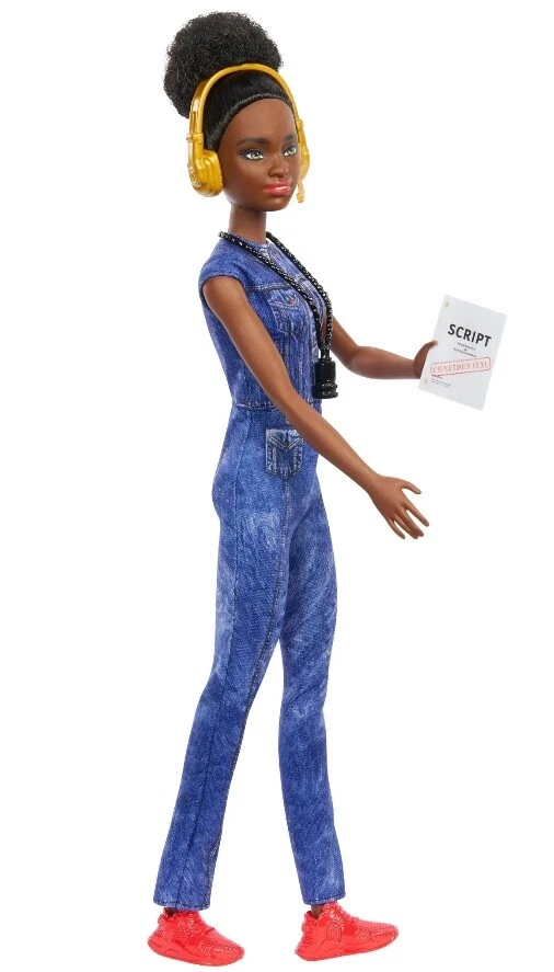 From the "Barbie Women In Film” set the Director Doll is an 11-inch collector doll by Mattel, featuring the character Christie from the Barbie franchise. This original Barbie doll, manufactured in 2023, is part of the Career Barbie product line and is designed to represent a female film director. The doll comes with black hair, brown eyes, and a dark complexion, reflecting an African American ethnicity. The doll wears a one piece denim jumpsuit, gym shoes and a headset. She cokes with a movie play script. It is still attached to the cardboard backing of its original box, making it suitable for display or collection.