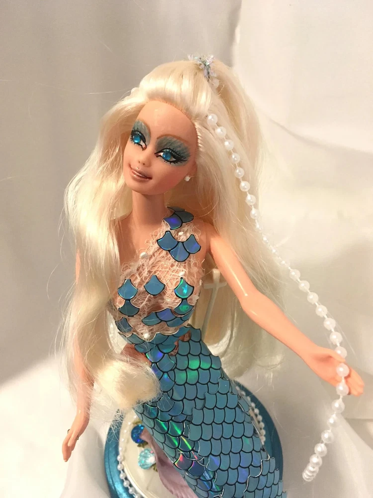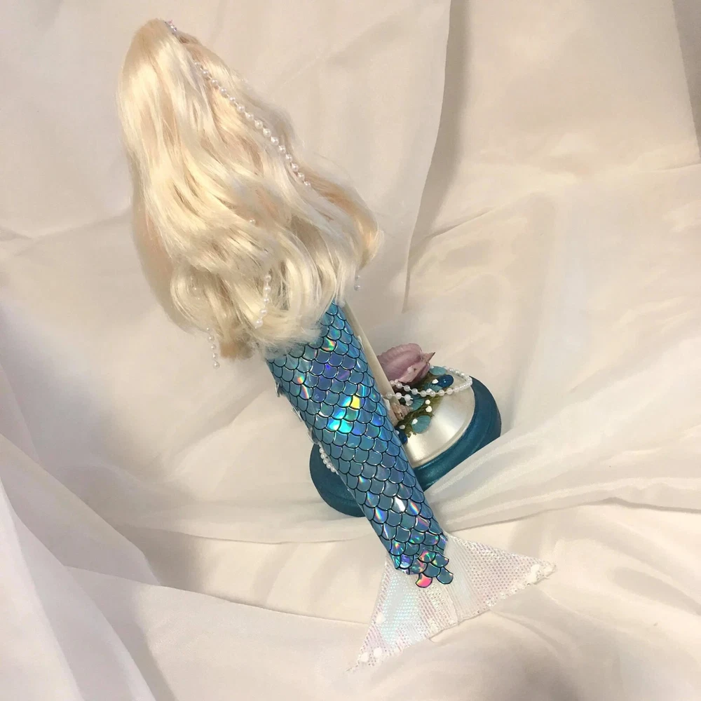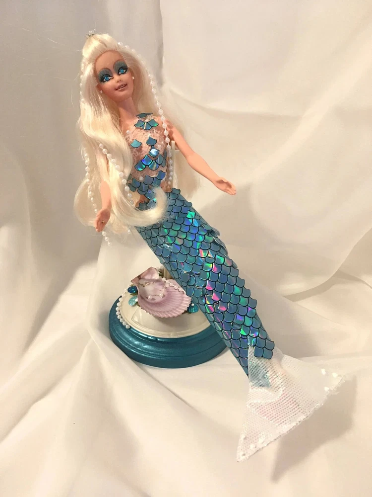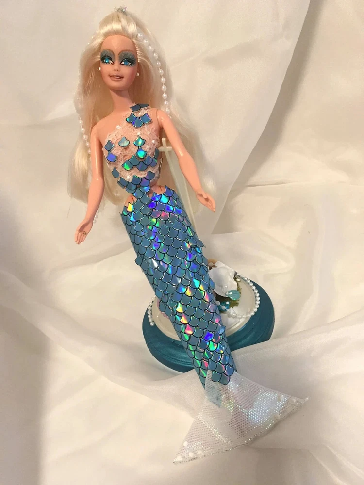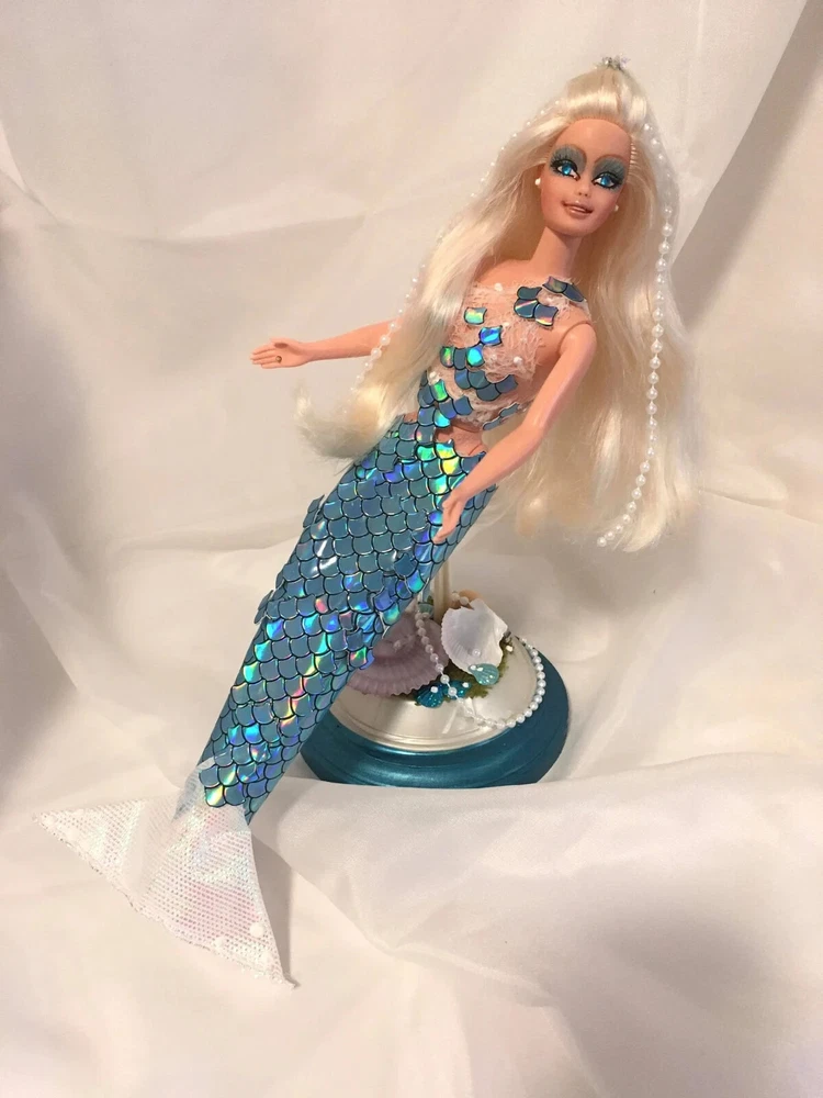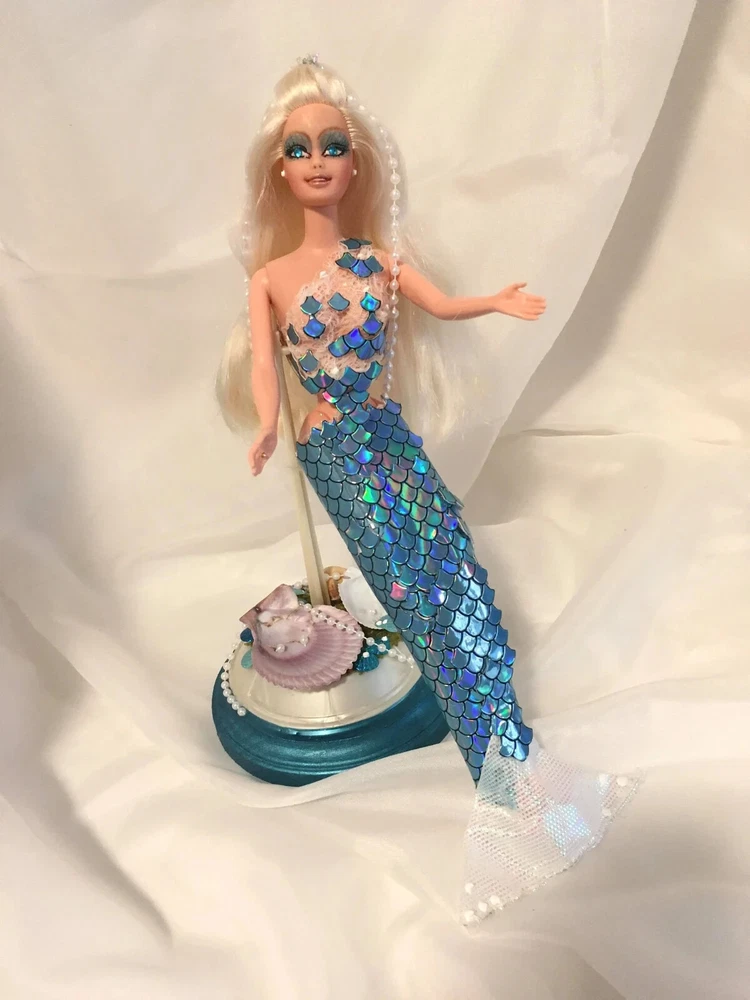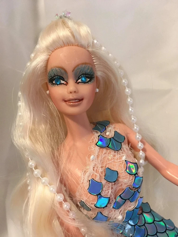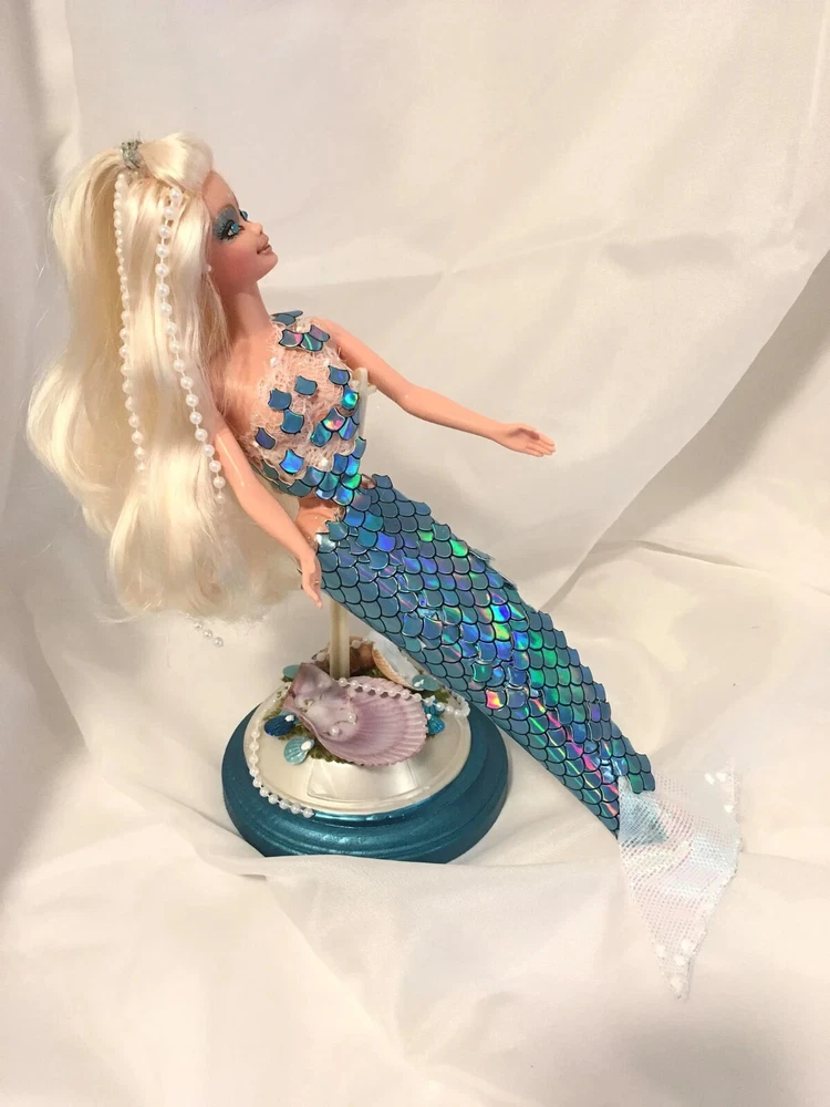12" tall Mermaid Barbie doll repaint, circa 1990's Signed & Numbered OOAK; one of a kind A siren of the deep, she has a new face, styled hair along with tail. Take a close look at all the detail. Gems for eyes Face repaint, hair restyled, total redress with matching stand. Jointed at neck, shoulders, waist and hips. This is not a toy Clothes are permanently attached. Look close; ask questions Shipping is FREE Thank you