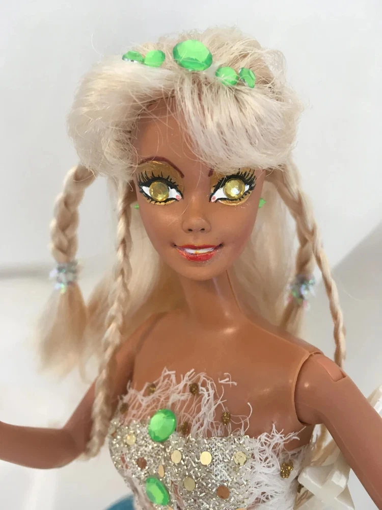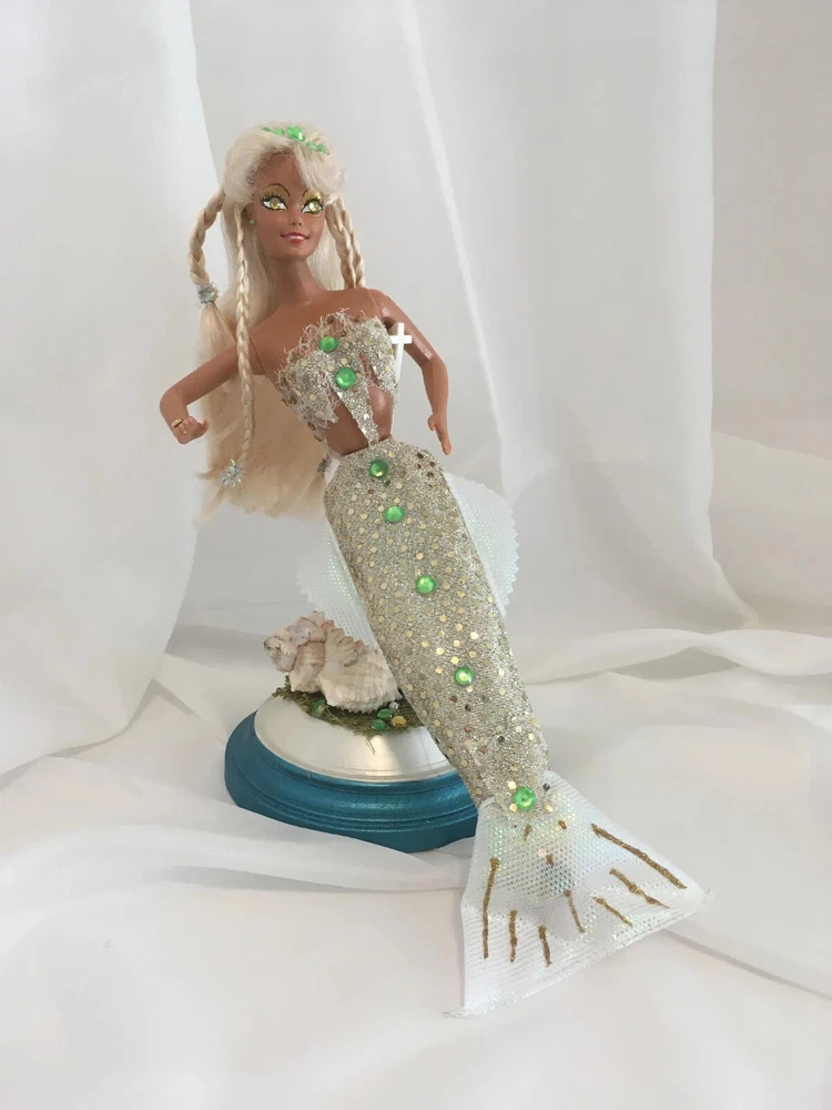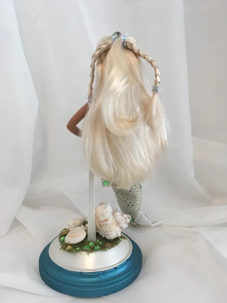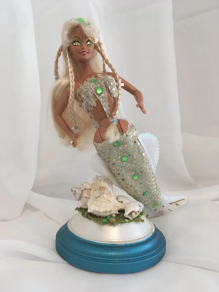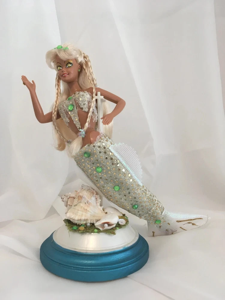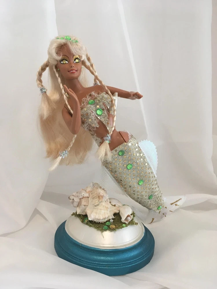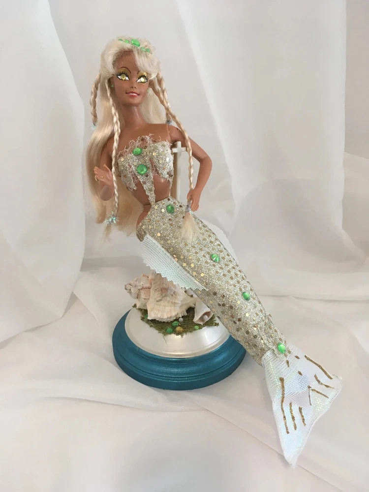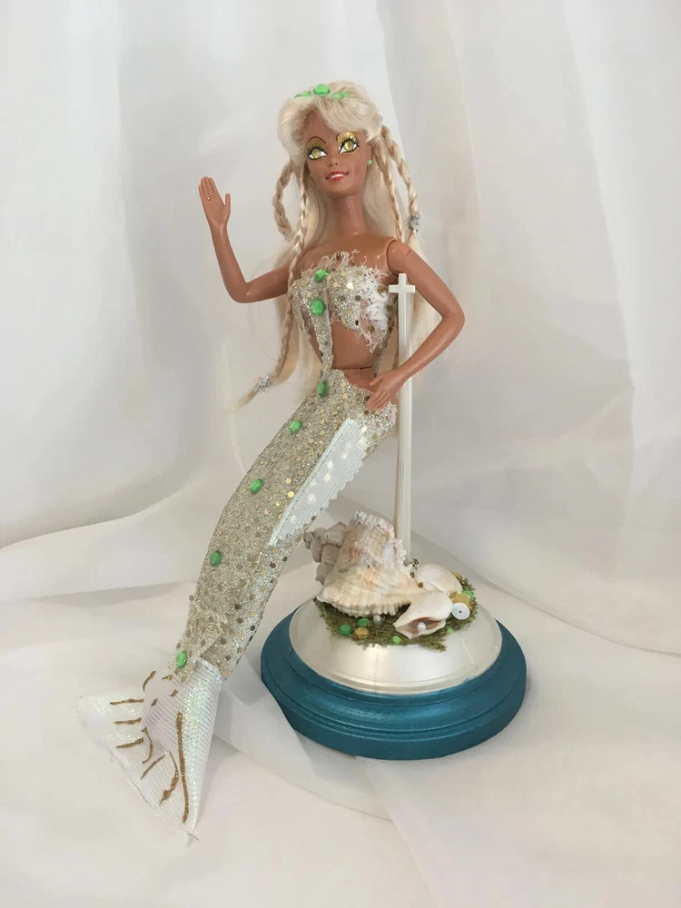 12" tall Mermaid Barbie Signed & Numbered; One of A Kind Doll is circa 1990's A siren of the deep, she has a new face, styled hair along with tail and fins. Jeweled eyes Take a close look at all the detail. Face repaint, hair restyle, total redress with matching stand. Jointed at neck, shoulders, waist and hips. Stand included. This is not a toy * Clothes are permanently attached. Look close; ask questions Shipping is FREE Thank you