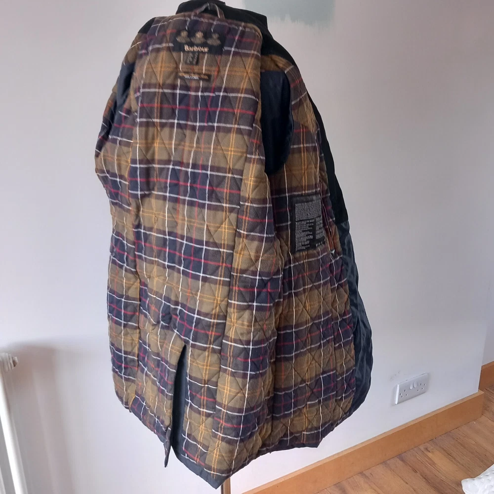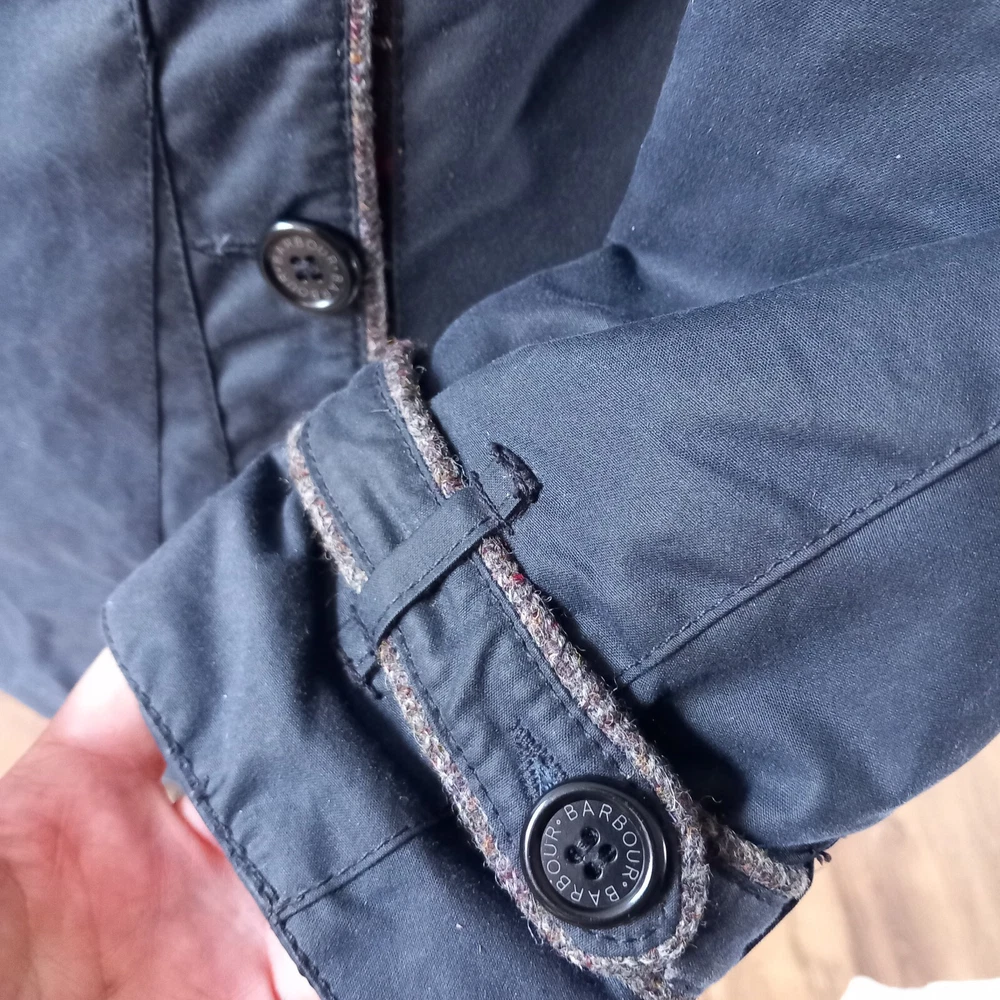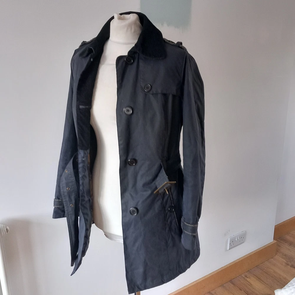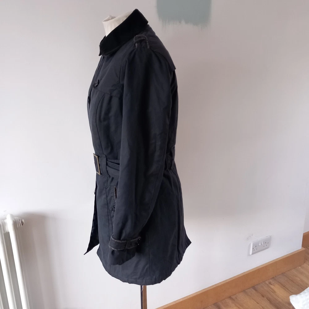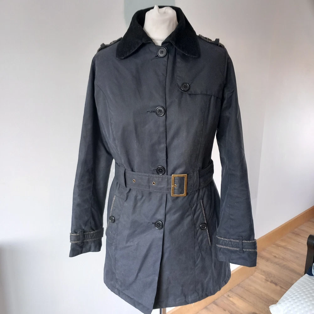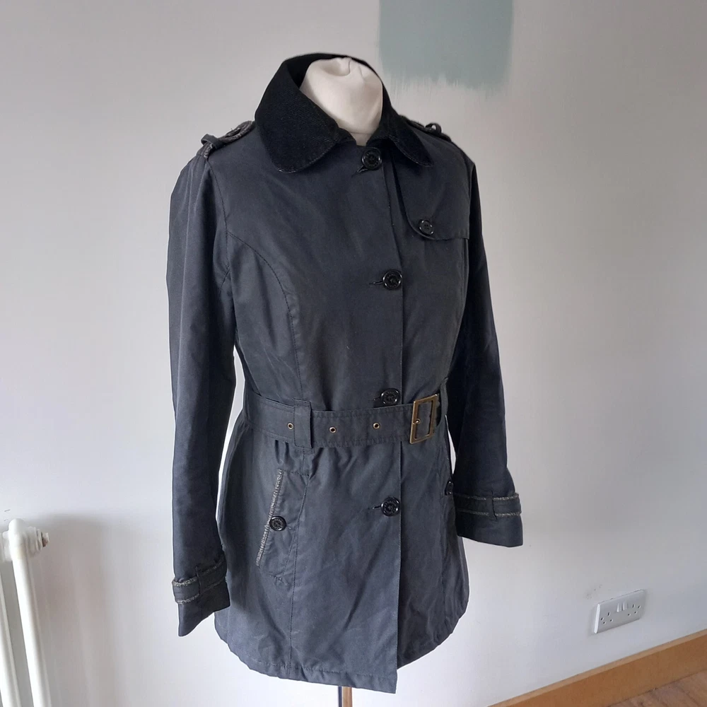 Barbour ‘Dalmeny Trench’ Waxed Jacket Women’s size UK 12 Blue waxed cotton outer Quilted cotton lining Belted waist Button closure Approximate Measurements A) Shoulders - 15" B) Pit to pit - 20” C) Nape to hem - 31” D) Pit to cuff - 18.5” E) Shoulder to cuff - 24"