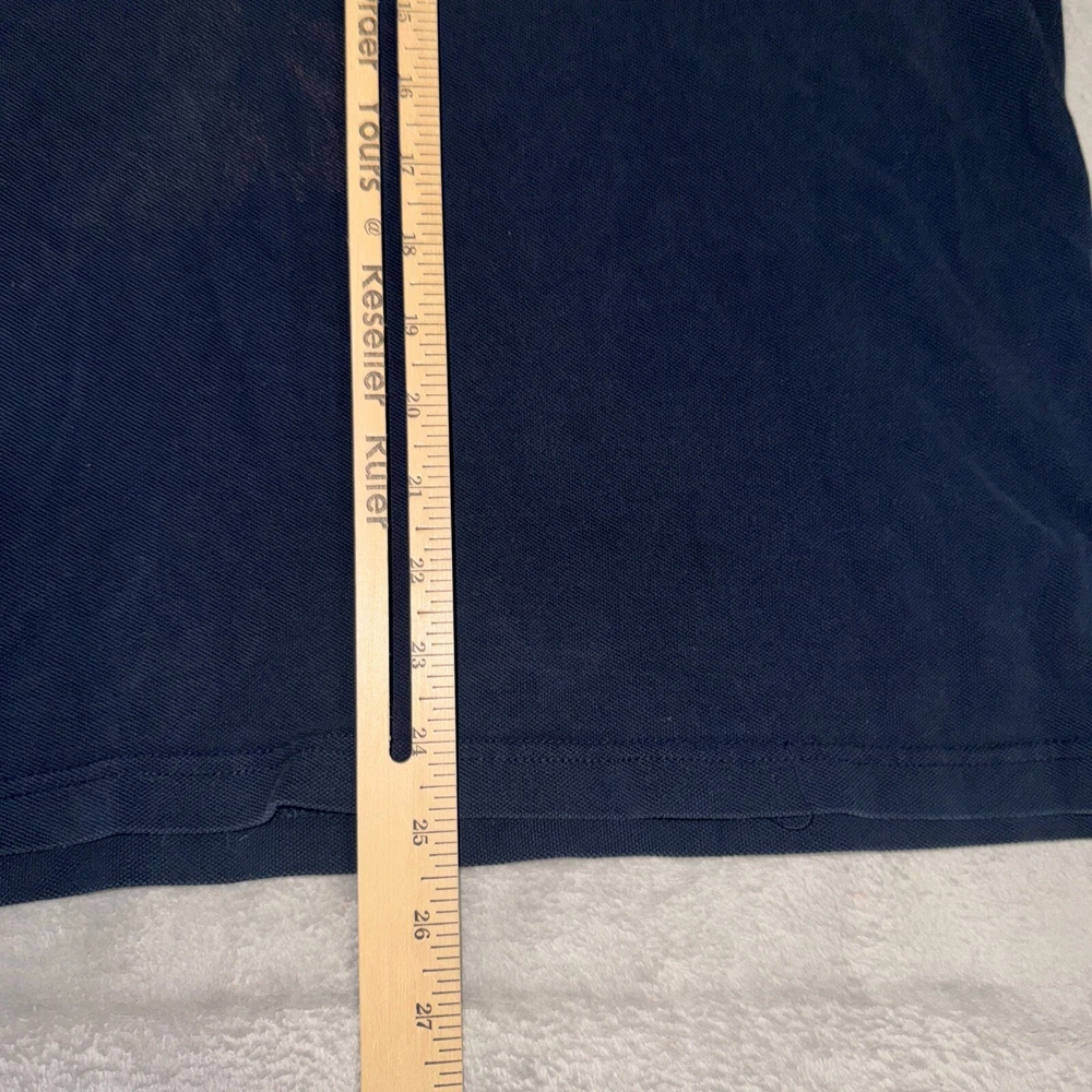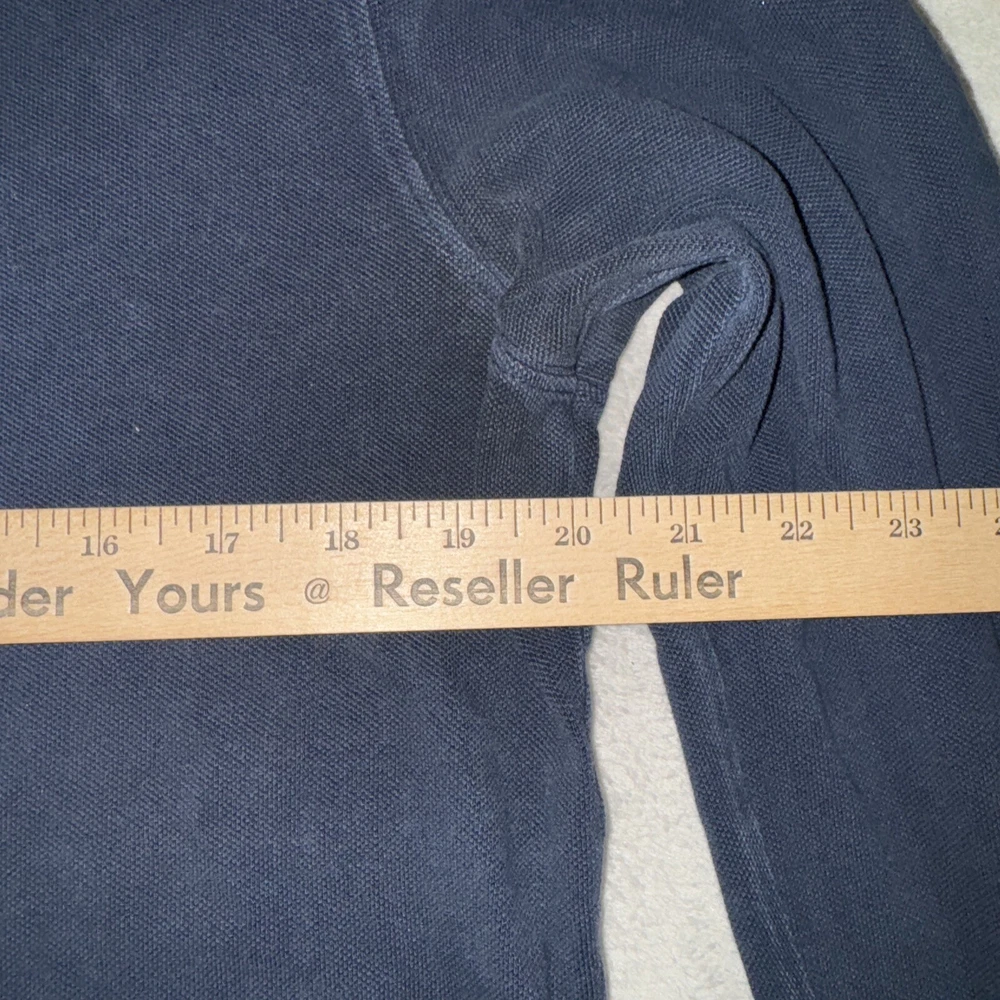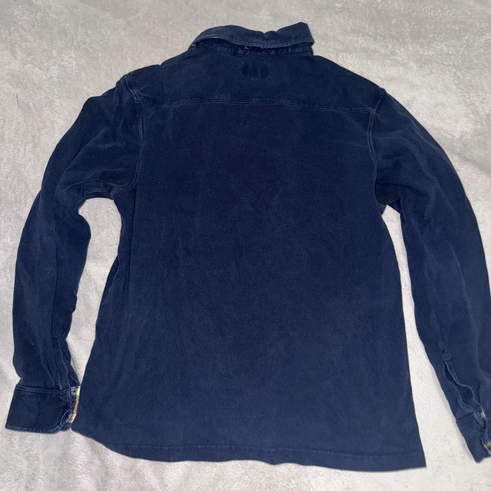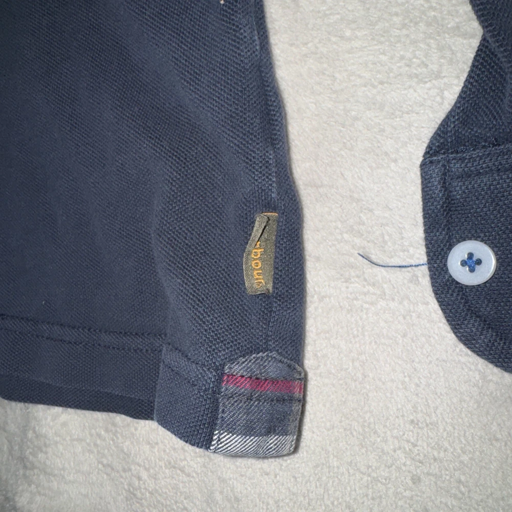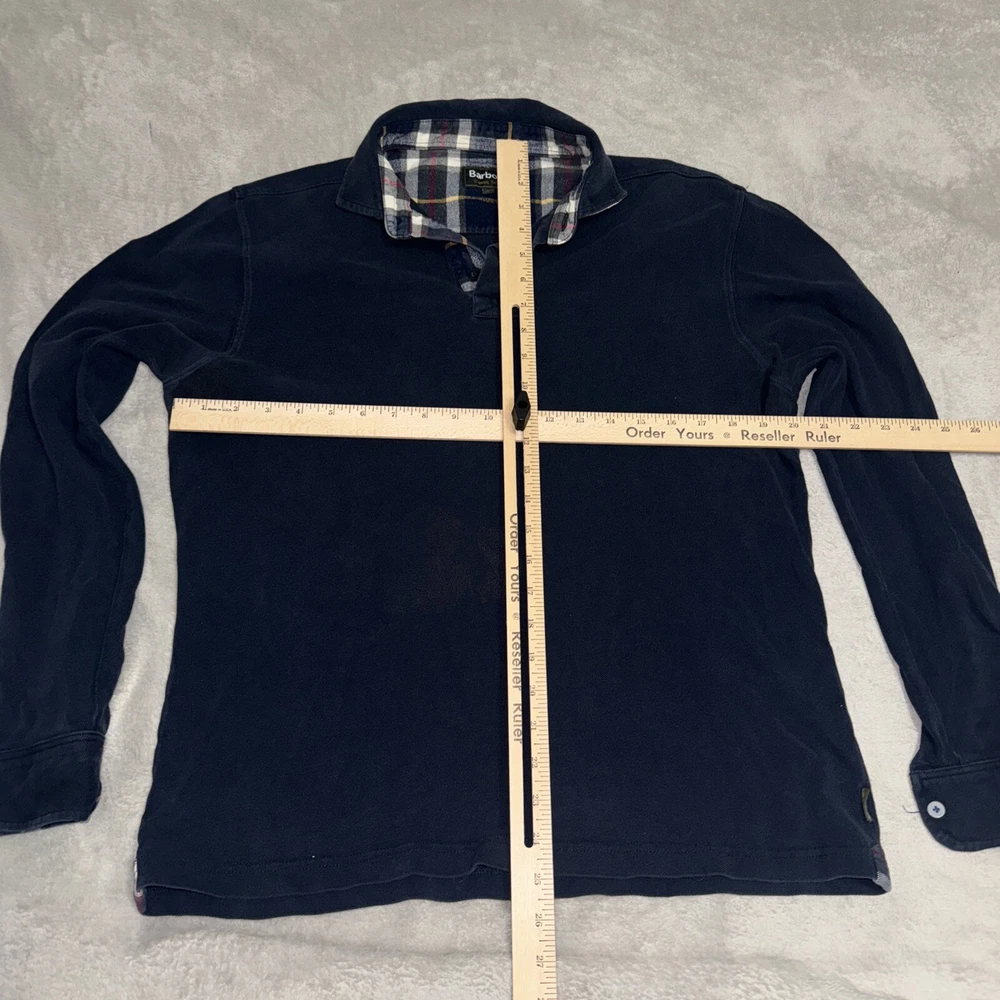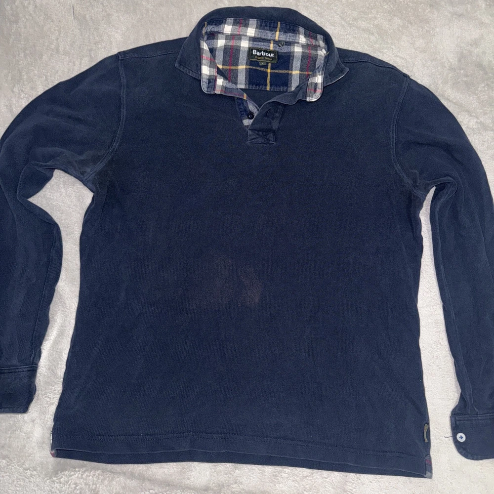 Slight discoloration on stomach area. Elevate your wardrobe with this sophisticated Barbour polo shirt. Crafted from high-quality fabric and featuring long sleeves, this polo shirt is perfect for any occasion. The dark wash adds a touch of elegance to the beautiful blue color, making it a versatile addition to your collection. This polo shirt is designed for men, with a regular fit and size medium. The Barbour brand ensures that you are getting a quality product that is both stylish and durable. Whether you're dressing up for a night out or just need a casual outfit for running errands, this polo shirt is the perfect choice.