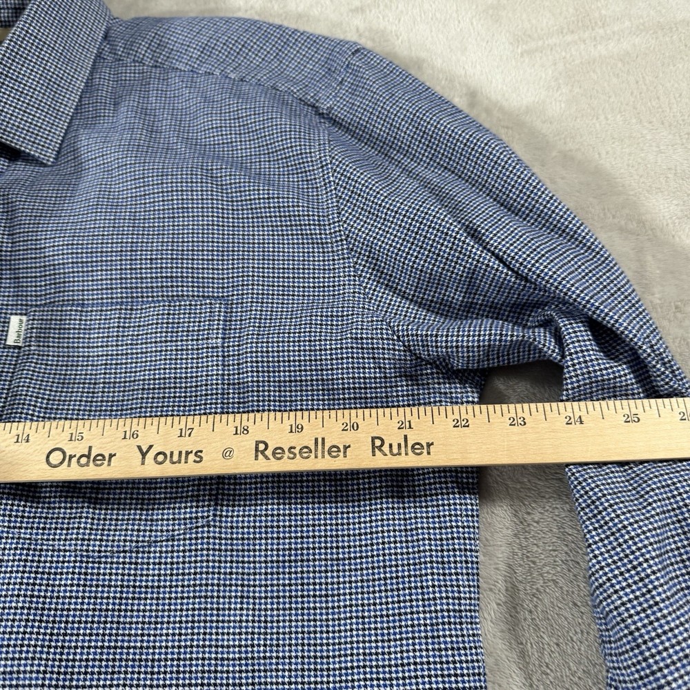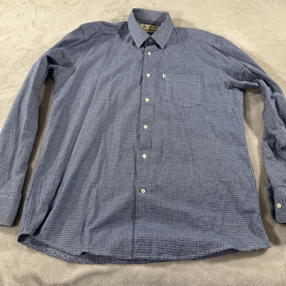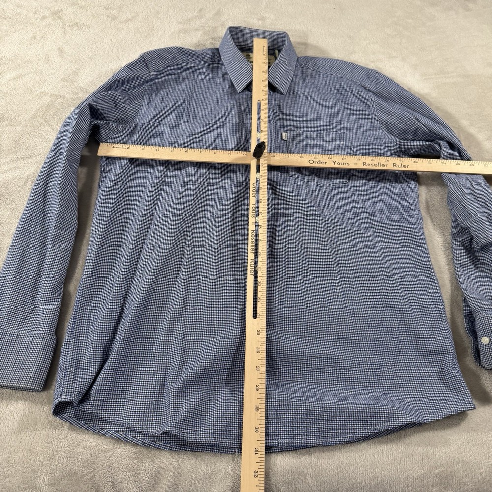 Upgrade your wardrobe with this stylish Barbour men's button-down shirt in a medium size. The thick, houndstooth fabric provides a classic and preppy look that is perfect for any occasion, from casual outings to cocktail parties. The shirt features a tailored fit and long sleeves, making it suitable for travel, workwear, and even walking. The shirt is made of a breathable and easy-care lyocell and cotton blend, with pockets for added convenience. The button-down collar and accents add a touch of designer and outdoor style to the shirt. This shirt is perfect for winter, fall, and spring, and can be easily cared for with machine washing.