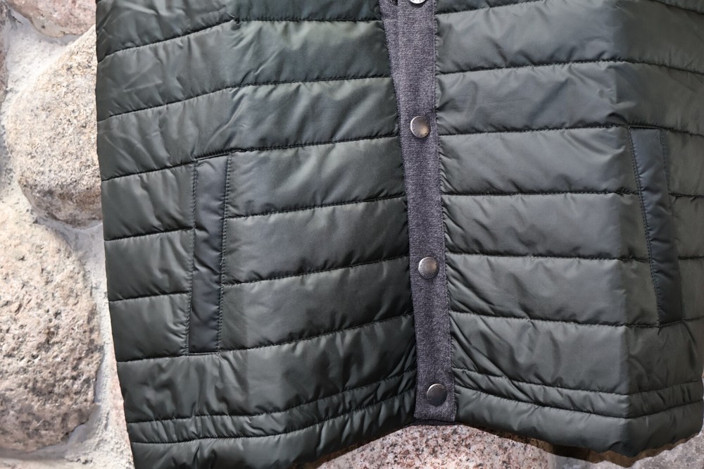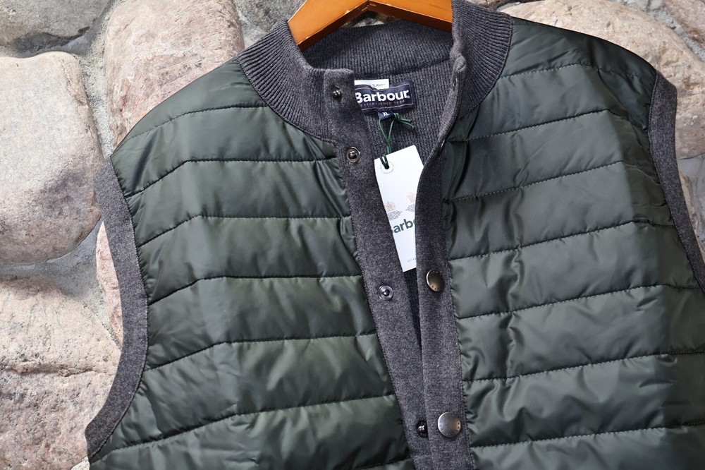 Item: Men's Vest Manufacturer: Barbour Condition: Size: Large L UK Sizing Line: MKN0920CH91 Material: Polyamide Cotton Blend Retail Cost: $160.00 Color: Front is GREEN Back is Charcoal Grey Measures: 22 inches across the back Pit to Pit PLEASE compare your size to this BEFORE you buy! NO two Barbour jackets fit alike. We use one set of pictures to represent all the sizes we have in a style. You will get the size listed in the listing not the size of the vest in the picture. Verify your size before buying 22 inches across back pit to pit This is cut slimmer then a U.S Extra Large!