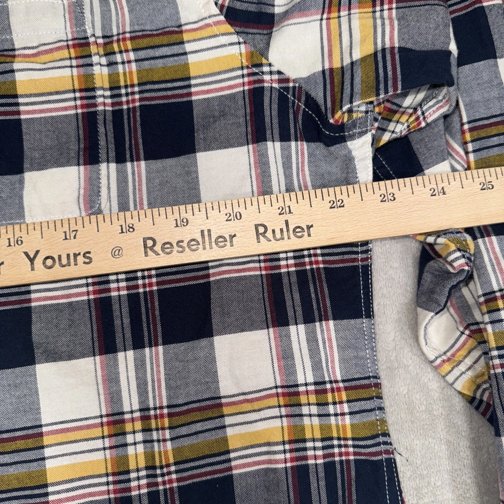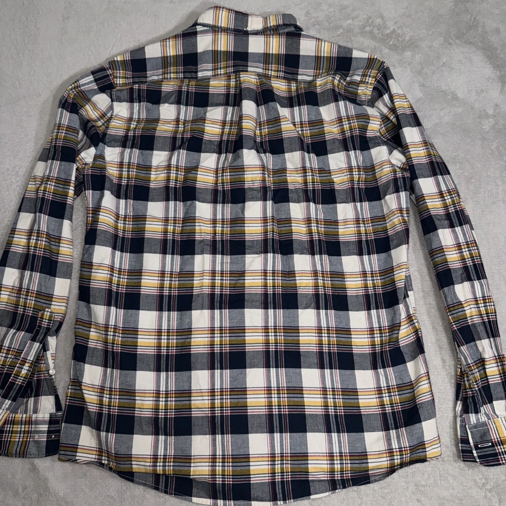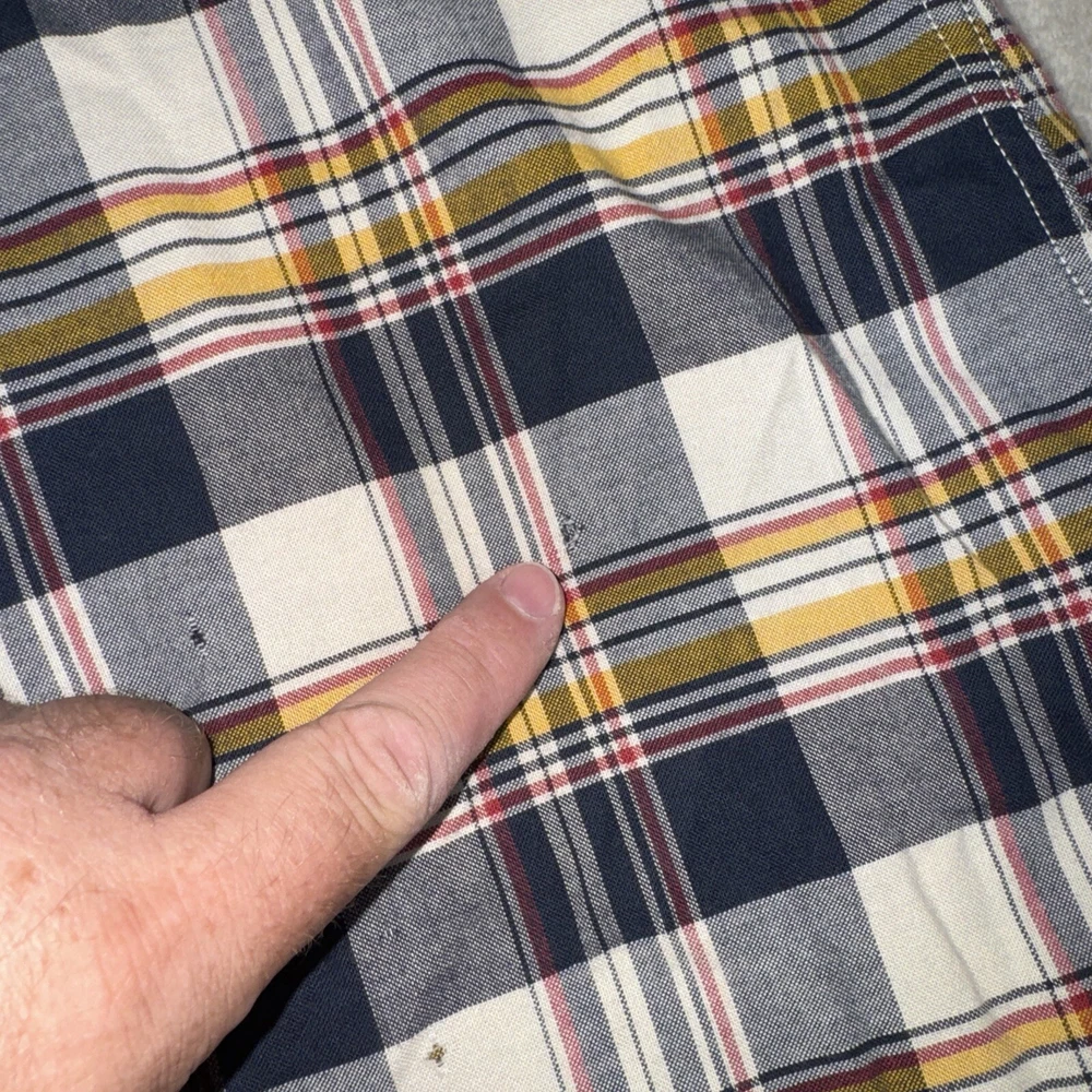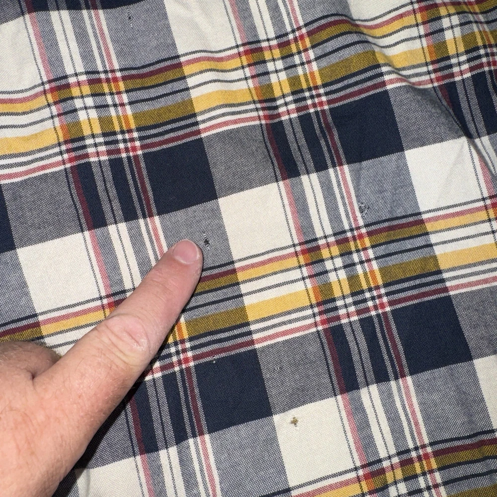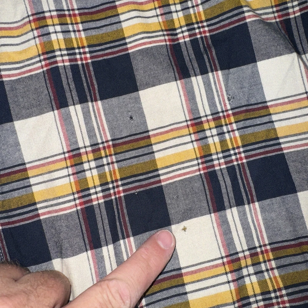 Some small holes on the front. See pics. This Barbour button-up shirt in a mix of plaid colors is a great addition to any men's wardrobe. The tailored fit and 100% cotton material makes it comfortable to wear all day long. Its button-down collar and long sleeves add to its stylish look. The shirt is perfect for casual occasions and can be dressed up or down depending on the occasion. The shirt is in excellent condition and ready to be worn and loved by its new owner.