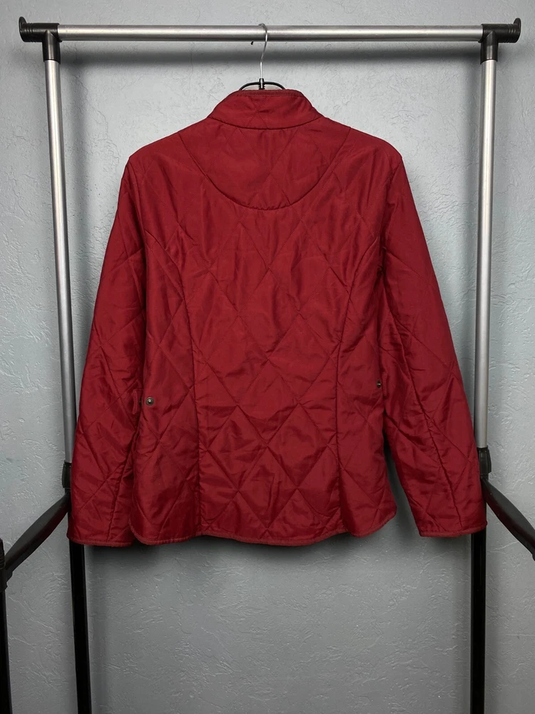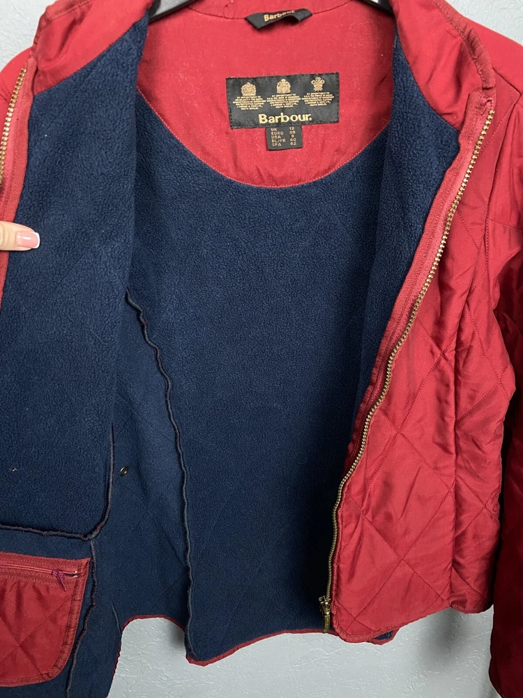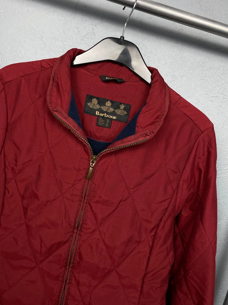 Personalize: No Insulation Material: Polyester Type: Jacket Size Type: Regular Handmade: No Accents: Quilted Country/Region of Manufacture: United Kingdom Department: Women Lining Material: Polyester Style: Quilted Closure: Snap Vintage: Yes Color: Red Brand: Barbour Season: Winter Fit: Regular Jacket/Coat Length: Short Sleeve Length: Long Sleeve Size: M Seller Notes: “Good condition.” Outer Shell Material: Polyester Pattern: Solid