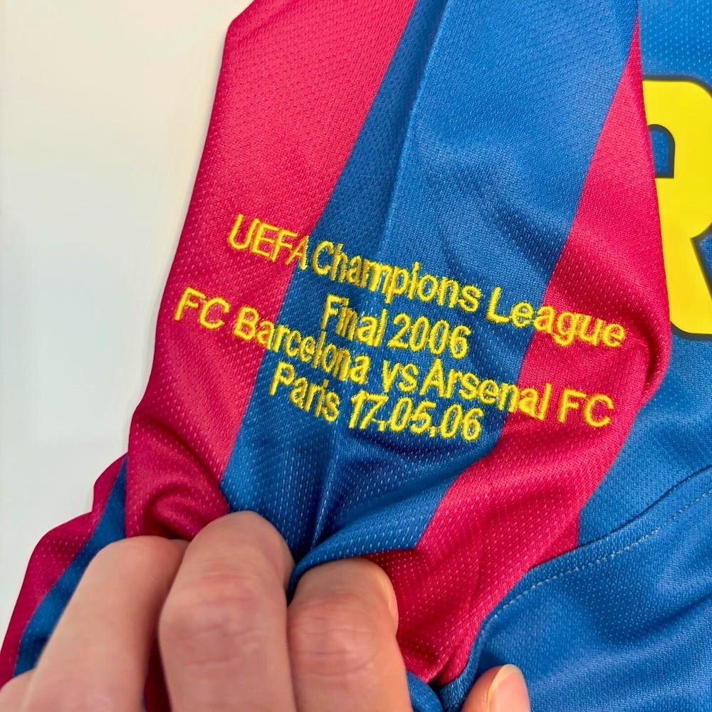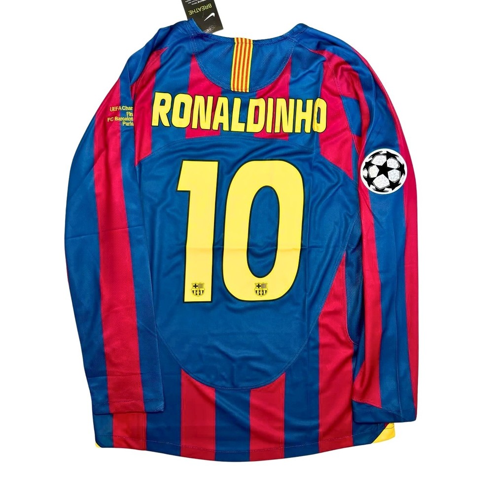 About: Step back into a golden era of football with this stunning Barcelona 2006 Champions League Final home jersey. This commemorative long-sleeve piece pays tribute to the legendary Ronaldinho and the historic night in Paris where the club secured its second European crown. The iconic vertical red and blue stripes are beautifully finished with detailed matchday embroidery on the chest, celebrating the final against Arsenal. Constructed from breathable, high-performance materials, this jersey features moisture-wicking technology to keep you cool and comfortable whether you’re on the pitch or in the stands. The long-sleeve design offers a classic, nostalgic silhouette that is perfect for cooler weather or as a stylish holiday gift for any devoted supporter. As a standout choice for the gifting, this jersey is an essential for collectors and fans who want to celebrate the artistry of the number 10. Relive the magic of the mid-2000s and honor the legacy of one of the game's greatest entertainers with this meticulously designed fan favorite. Details: Condition : Brand new with tags Style : Fan version Football shirt Details : Stitched team crest and logo / Player name and number are pressed Size : Unisex adults - Loose fit Shipping: Free shipping worldwide Processing within 2 business days Get it delivered within 5-10 Business days. Tax free: All taxes are covered, what you see at checkout is the final price you pay. Returns: We got you covered, Simply reach out to us within 30 days of delivery for a smooth solution. Take care of your jersey: Wash: Inside out, cold water (30°C max), and a delicate cycle. Detergent: Mild liquid only; no fabric softener or bleach. Dry: Air dry only on a hanger. Never use a dryer. Iron: Steamer only, or iron inside out on the lowest heat with a towel barrier. Storage: Hang it up to avoid creasing the logos/printing.