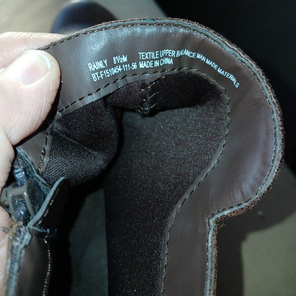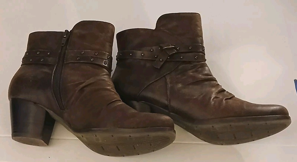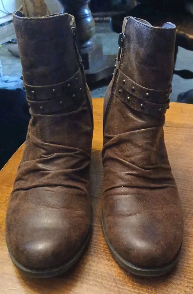 Step out in style and comfort with the Baretraps Rainly ankle booties. These brown booties feature an almond toe shape, a zip closure, and a studded leather band accent for a touch of edginess. They also feature a knot detail on the side. They are perfect for any occasion, whether it's for travel, casual outings, or business meetings. Signs of wear on upper front and toe area. (See last 2 pictures)
