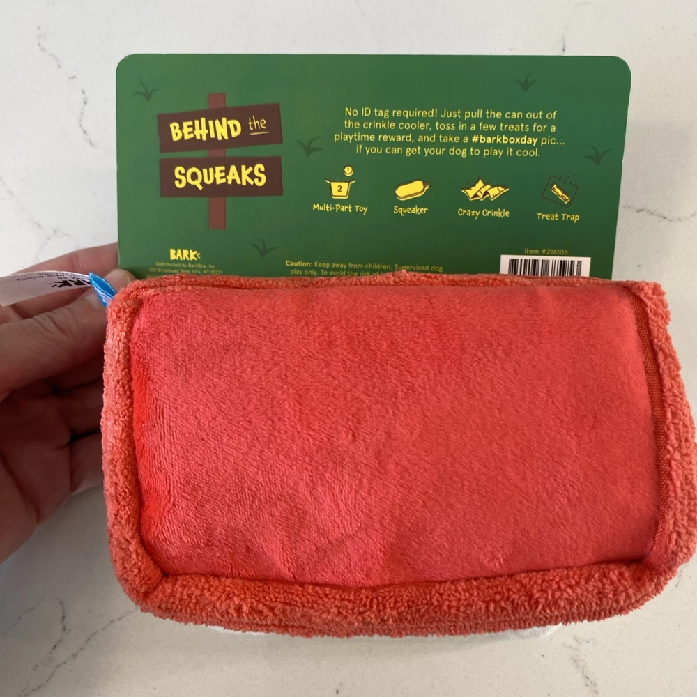 Bark Dog Toy Plush Cooler Beer Fetch A Cold One Squeak Crinkle Size M-L 20+ lb