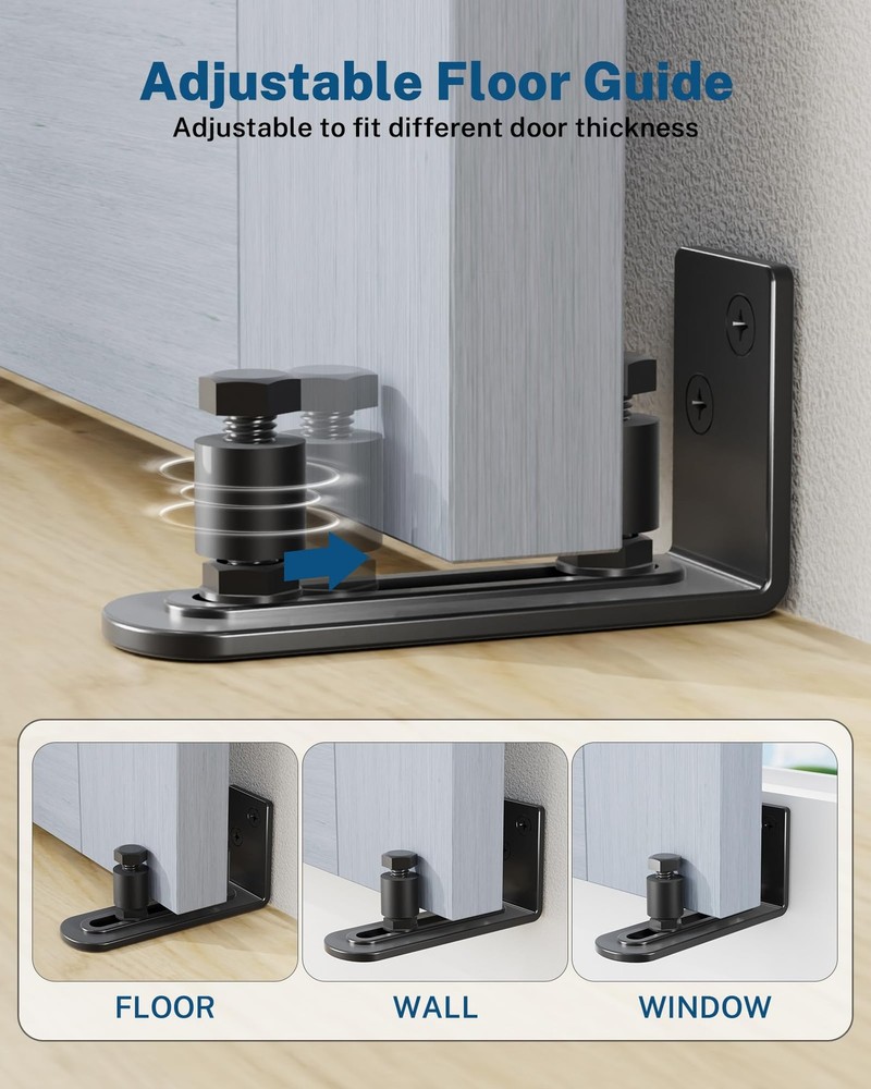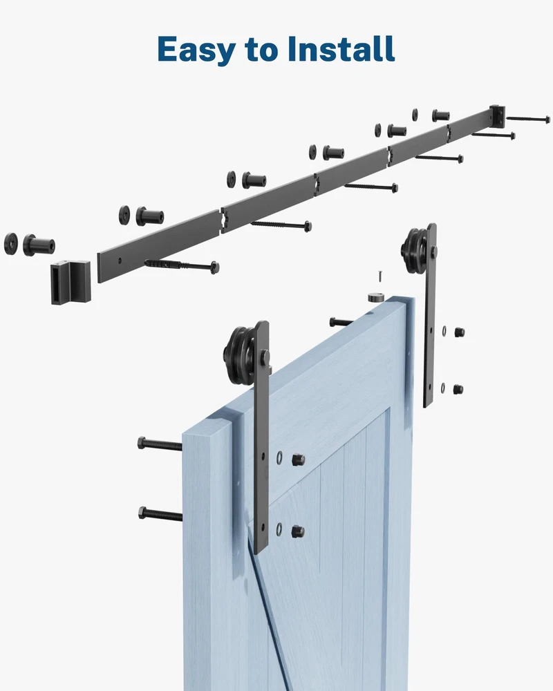 The Barn Door Hardware Kit is a popular choice for installing sliding barn doors in various spaces like kitchens, bedrooms, or garages. This sliding door hardware kit fits door panels 34" to 37" Width and 1-3/8" to 1-3/4" Thickness. Easy Installation Comes with mounting hardware and instructions. Package Includes: 5x Rail (combine to 6.6ft), 1x Adjustable Floor Guide, 6x Spacer & Lag Bolt, 2x Hanger, 2x Door Stopper, 2x Anti-jumper, 1x Clear step-by-step guide for installation Key Features: Heavy-Duty Steel Construction Made from durable steel with a black finish, ensuring sturdiness and resistance to wear. Supports doors up to 260 lbs, making it suitable for solid wood or heavy doors. Complete Kit Includes: 6.6FT (79-inch) Track Rail – Fits standard door openings (typically up to ~5ft wide). Rolling Mechanism – Smooth-gliding rollers for quiet operation. Anti-Jump Safety Design – Prevents the door from derailing. Floor Guide – Keeps the door stable and prevents swinging. Handles & Latch – Decorative and functional for easy opening/closing. Aesthetic Appeal Black finish suits modern, rustic, or industrial décor. Suitable for interior or outdoor use. Things to Consider: ✔ Door Size Compatibility – Ensure your door is within the weight limit (260 lbs) and width (track covers ~79"). ✔ Wall Strength – Must be mounted on a solid surface (studs or reinforced header). This Barn Door Hardware Kit is a reliable option for DIY barn door installations. Premium Barn Door Hardware Kit: Our sliding barn door hardware is made of 1/4" thick high-quality solid carbon steel, with a matte black powder-coated finish Heavy Duty Sliding Barn Door Hardware Kit: 14.99lb Industrial grade sliding rail supports doors Weight limit 260lbs, fits per door panel width of 34-36inch and 1-3/8" to 1-3/4" Thickness Package Included: 6.6FT splice rails, 1 pair of rollers, door stopper, door handles, latch, floor guide, installation Manual and all accessories required for sliding barn door installation (Door Panels NOT INCLUDED) Easy to Install: Our farm door hardware kit comes with clear step-by-step installation suits for dividers spaces, including living rooms/kitchen/bedroom/storage rooms/bathroom. For optimal installation, 2-person installation advised Note: Before purchasing a sliding barn door hardware kit, please measure the opening size for each door. For Single Doors: Track length = 2 × door width (Example: 3FT wide door opening → 6FT Track Rail needed for full coverage) Space-saving barn door hardware kit cooperate nylon-encased ball bearings, vibration-dampening rubber stoppers roller and adjustable floor guide slides smoothly and quietly