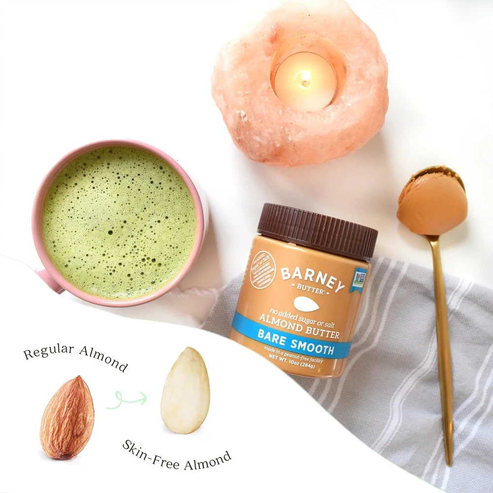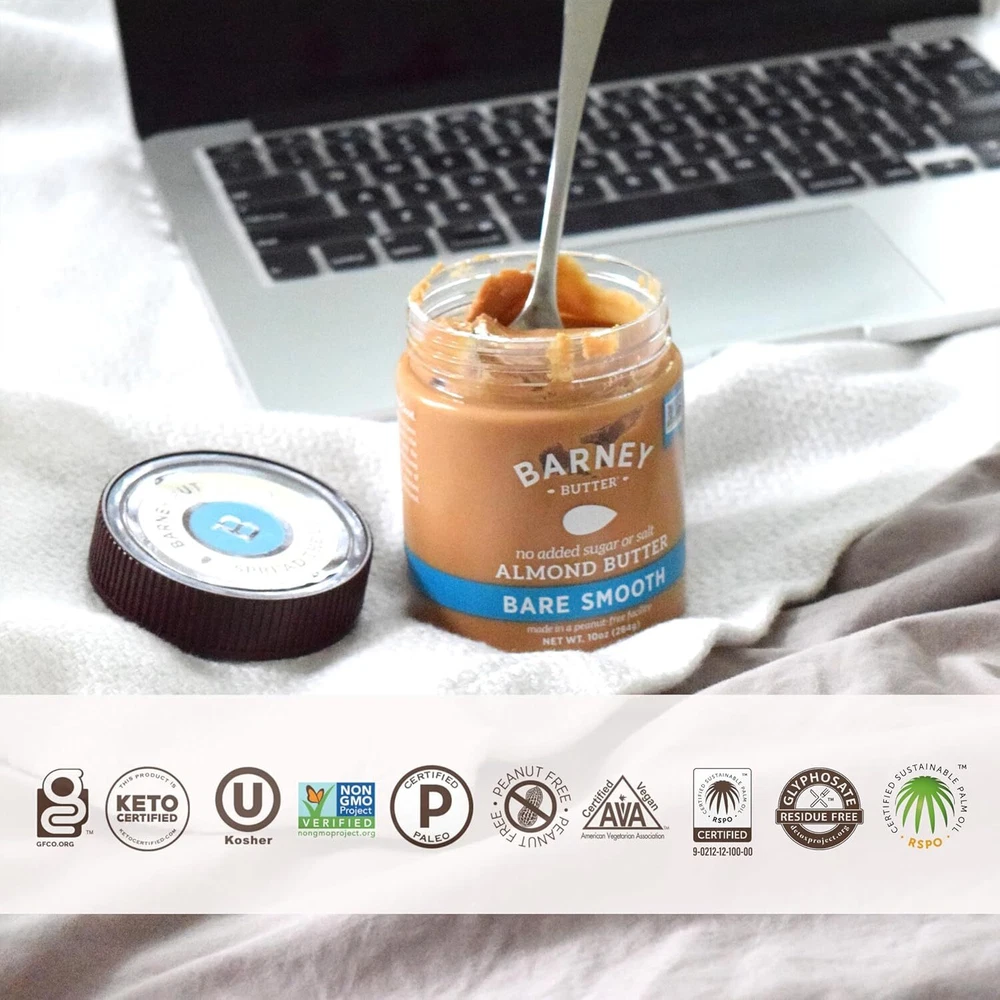 SCRUMPTIOUSLY SMOOTH: Contains a 10-ounce jar of classic, smooth and spreadable Barney Bare Smooth Almond Butter with NO added sugar or salt. We blanch fresh almonds in small batches to remove gritty skins for an ultra-smooth, creamy texture SKIN FREE, CALIFORNIA ALMONDS: Premium California almonds, sourced from our neighbor farmers in the heart of what we call “Almond Alley” California. Ultra-smooth, no stir, grit-free almond nut butter HEALTHY FATS: Almonds are an excellent source of healthy fats which are an essential part of a balanced diet. Blanching ensures your body absorbs the nutritional benefits of almonds ALLERGEN FRIENDLY: Manufactured in a peanut free facility, gluten free, soy free, dairy free and egg free FITS YOUR HEALTHY LIFESTYLE: Clean eating plant based protein that's certified non-GMO, RSPO Certified Sustainable Palm Oil, Glyphosate Residue Free Detox Project Certified, Paleo Friendly, Keto, Vegan and Kosher MADE IN AMERICA WITH CALIFORNIA ALMONDS Our "original, classic" with NO added sugar or salt. Super-smooth and spreadable, made with skin-free roasted almonds, which makes for a grit-free texture and mild almond taste. PERFECT almond butter for those who are looking for no added sugar, and great for baking recipes and smoothies where added sugar or salt is not preferred.