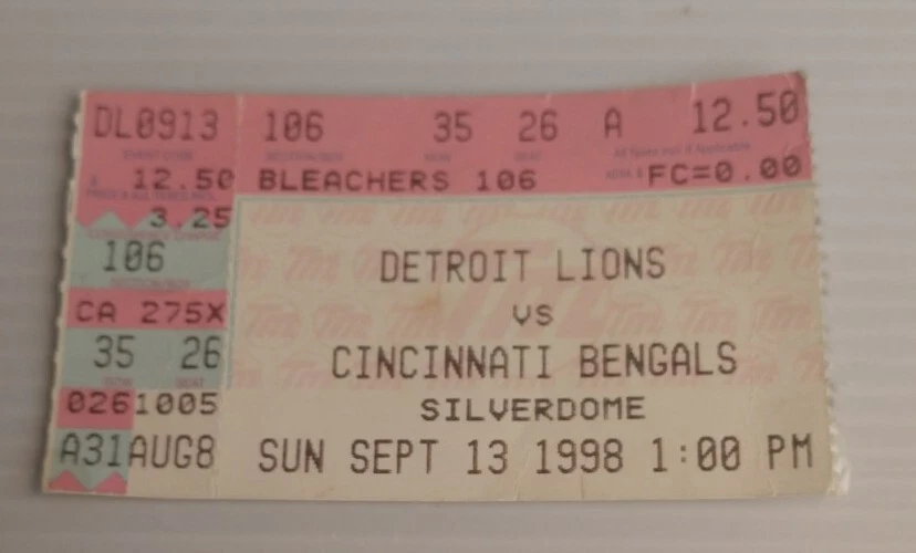 This ticket stub is a rare piece of vintage sports memorabilia from the Detroit Lions vs Cincinnati Bengals game held on September 13, 1998. The stub features Barry Sanders rushing for 185 yards+ 1 pass for 44 yards + 3 TD'S. Game was lost to Bengals in overtime when Corey Sawyer ran interception 58 yds for TD at 2:08 OT. Is a must-have for any football fan and collector. The original, very good condition stub was made in the United States and is a unique addition to any sports collection. Whether you are a fan of Barry Sanders, the Detroit Lions, or just a lover of vintage sports memorabilia, this ticket stub is a great find. See scans to help determine the condition.