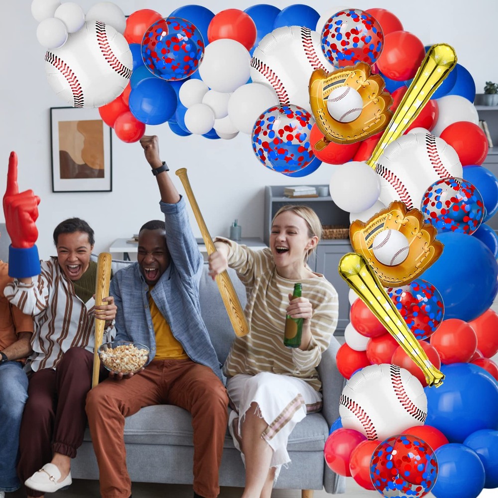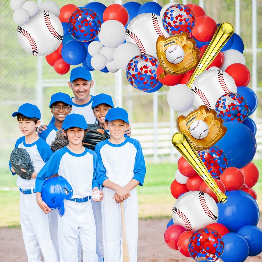 Baseball Balloon Garland Arch Kit 【Baseball Party Decorations】You will get 113 pieces of baseball party balloon garland kit. 28in baseball Bar balloon*2, 18in blue balloon*2, 18in baseball glove balloon*2, 18in baseball balloon*4, 12in confetti balloon*6, 10in red white and blue balloon*60, 5in red white and blue balloon*30, gule*5, 16Ft balloon strip*1, ribbon*1 【Unforgettable baseball themed party】Our red white and blue baseball balloon garland kit helps you throw an unforgettable baseball themed, sports themed party, liven up your party 【High quality material balloons】Red white and blue balloons are made of latex, baseball balloons are made of aluminum film, thick and enduring, please feel free to use. Warm tips: please do not inflate too full 85% or more, too full will burst, it is recommended to use air to inflate confetti balloons 【Easy to assemble】Inflate the red, white and blue confetti balloons and string them in the holes of the garland arch strip, then put the baseball cutout on the balloon or wall with adhesive dots, hang the balloon garland according to your favorite shape, you will get a beautiful balloon garland party background 【Wide application】Baseball theme party balloon garland arch kit is perfect for birthday party, baby shower, baseball game, sports party or super boy hero theme party, we are sure your family and friends will make unforgettable memories at this baseball party