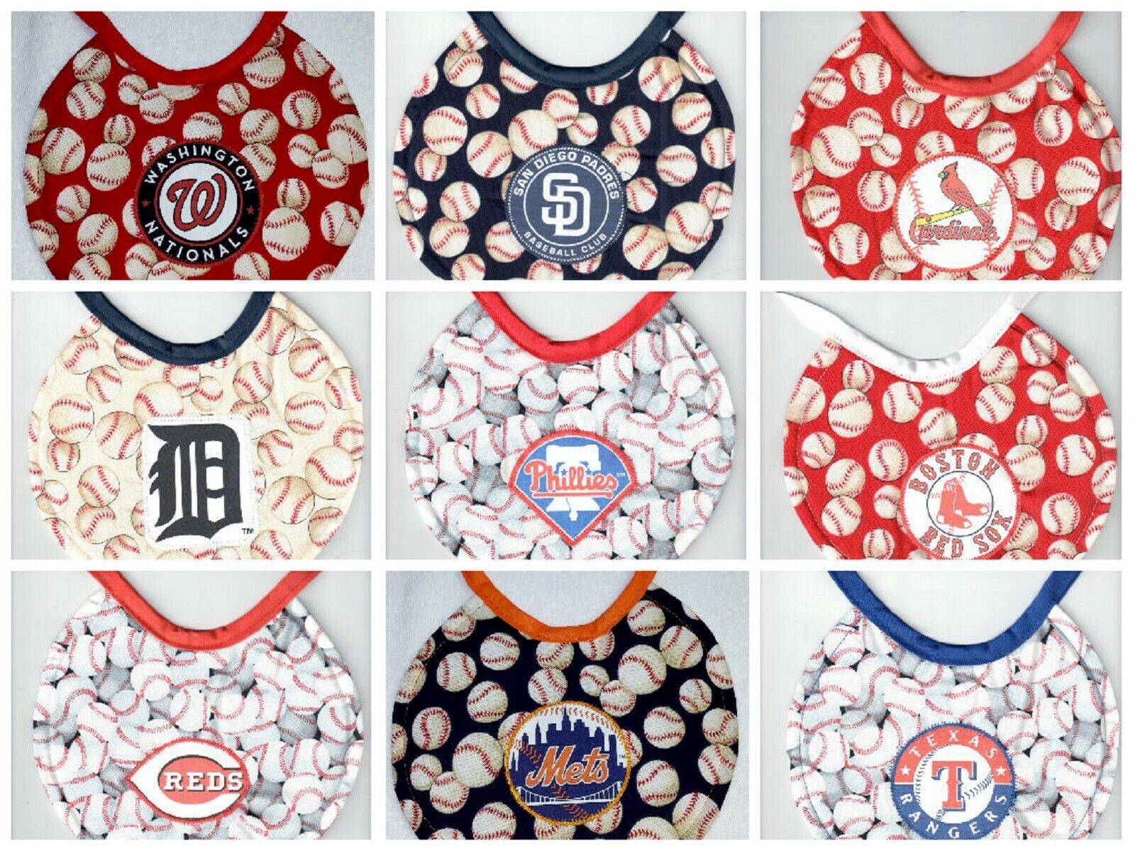 Newborn Size Bibs Each bib measures approximately 8" wide by 8" long and have 10" ties or a snap on one side. They are machine washable. All of my bibs are made from new, unwashed fabric and Non-Allergenic batting with white cotton fabric for the backing. Special Orders are accepted. If you want a particular color that you see in a picture, make sure to let me know. Otherwise, I use what I have on hand and looks the best. Free shipping!! (To the continental 48 states.) Check out my other bibs!!!!!!!!!!! NBA https://www.ebay.com/itm/184920201859 NCAA https://www.ebay.com/itm/181217894369 NFL https://www.ebay.com/itm/290958776564 NHL https://www.ebay.com/itm/181490944947 We have a smoke free home Please ask any questions you may have before you make your purchase. This item is NOT a licensed MLB product. It is, however, individually HANDCRAFTED with care and love from lawfully purchased, licensed MLB fabric. Happiness Homemade is not affiliated with, sponsored by, or licensed by MLB and/or the manufacturer of this fabric in any manner. I pride myself on thorough, accurate item descriptions and fast shipping with secure packaging. I also understand the importance of communication, and I answer all questions quickly. So, send me any questions you have, check out my excellent positive feedback record and PURCHASE WITH 100% CONFIDENCE! If returns are needed I can refund only the cost of the item, after it has been shipped back to me.
