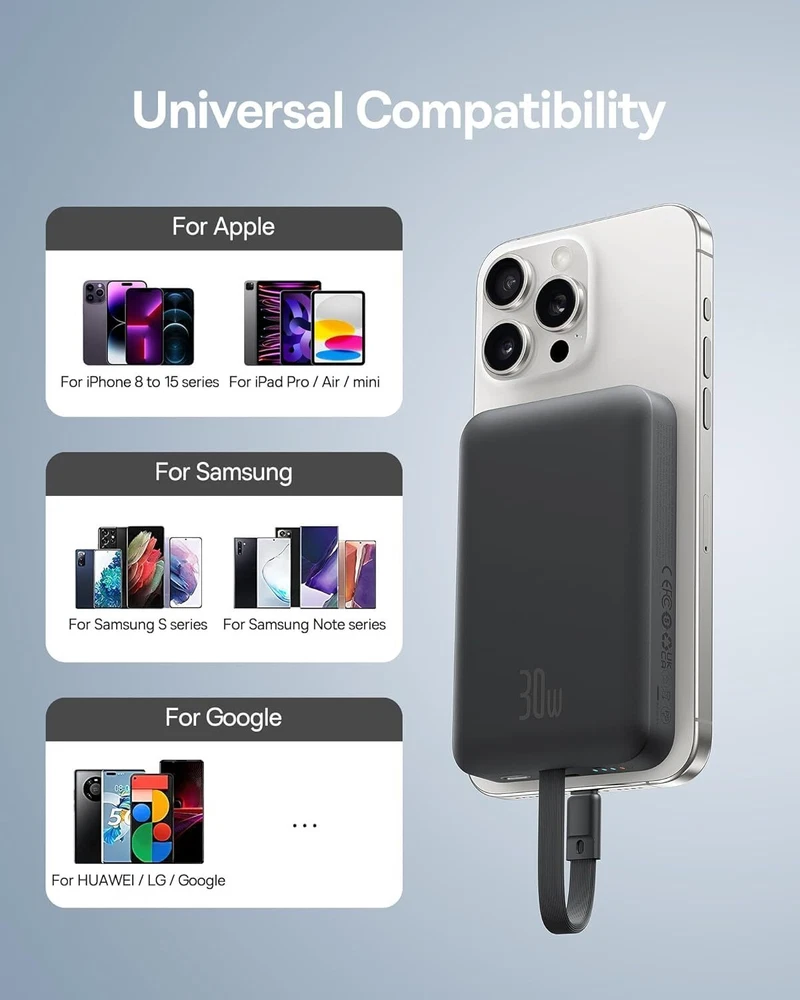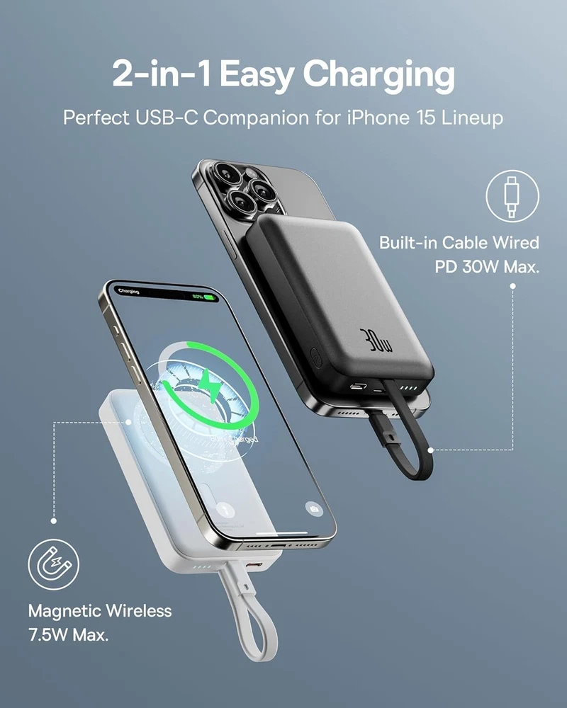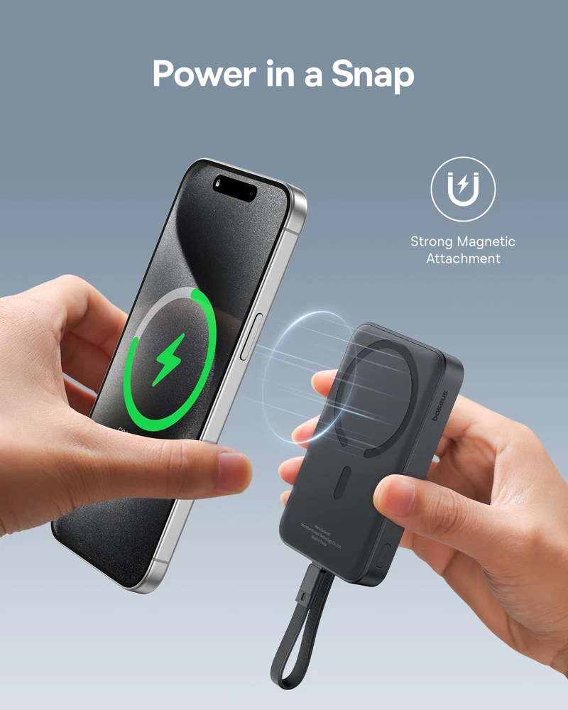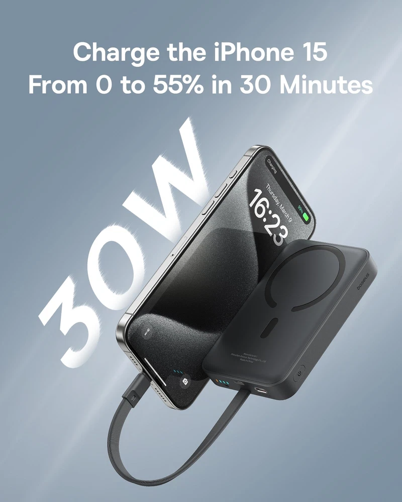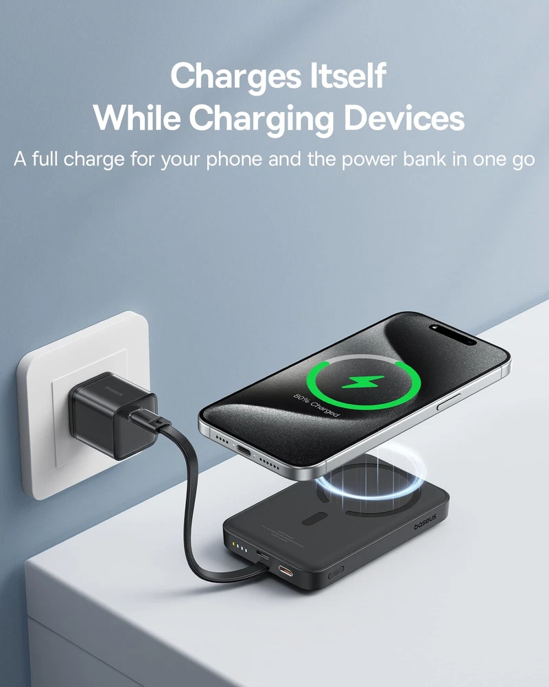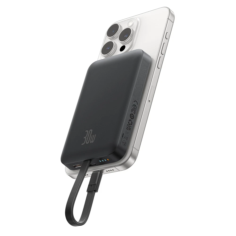Baseus Magnetic Power Bank, 30W PD Fast Charging 10000mAh for Magsafe Battery Pack Built-in USB-C Cable (in&Out), Portable Charger for iPhone 15/15 Plus/15 Pro/15 Pro Max, Galaxy, iPad, Pixel (Black) Description Features: Recommended by MacworldBaseus Magnetic Power Bank was featured in Macworld, America's leading tech media outlet, as "Real portability with power to spare",and won the Macworld Editors' Choice Award. 30W PD Supercharge Baseus magsafe power bank features 30W Power Delivery high-speed charging. It can charge your iPhone 15 to 55% / Samsung S23+ to 62% / Pixel 6 to 49% in 30 minutes using the built-in USB-C cable. 2-in-1 Power Bank In addition to magnetic charging, Baseus portable iPhone charger also provides USB-C wired charging. When your phone is low on power and needs to be recharged urgently, using the built-in USB-C cable to quickly charge is the best solution. Two-Way Fast Charging Cable Forgot to bring the charging cable and cannot charge the power bank? Is the cable too long and unsightly? The built-in cable on this Baseus battery bank perfectly solves your troubles. It provides 18W fast recharging and can fully charge the portable charger in about 2 hrs. Compact & Capable While equipped with 10KmAh large-capacity battery, we tried our best to make it pocket-friendly. The 13N strong magnets can hold your device firmly, convenient for handheld and one-handed use. More CompatibleThe Baseus magnetic power bank made of skin-friendly material for a more comfortable grip. Know you and know your devices with wide compatibility. Magnetic charging is available for iPhone 12/13/14/15 series. USB-C cable charging compatible with iPhone 15 series,Galaxy S24 S23, LG iPad Macbook Steam Deck and all USB C devices. What You Get Baseus 30W Let's C magnetic battery pack with built-in USB-C cable *1,user manual *1, Baseus mascot sticker*1, Baseus 2-year coverage. If you have any questions about our products, please let us know immediately. Product Details: Connector Type: USB Type C Brand: Baseus Battery Capacity: 10000 Milliamp Hours Color: Cluster Black Special Feature: Built In Cable, Fast Charging, Pocket Size, Wireless Charging Model Number: PPCXM10T Brand Name: Baseus Item Dimensions L x W x Thickness: 4.1"L x 2.7"W x 0.78"Th Battery Cell Type: Lithium Polymer Color: Cluster Black Warranty Type: Limited Recommended Uses For Product: Indoor/Outdoor Is Product Cordless: Yes Rapid Charging Performance: 55 percent in 30 mins for iPhone 15 Pro Compatible Devices: Compatible with iPhone 15,iPhone15 Plus,iPhone 15 Pro,iPhone 15 Pro Max ,iPhone 14 Pro Max, iPhone 14 Pro, iPhone 14 Plus, iPhone 14, iPhone 13 Pro Max, iPhone 13 Pro, iPhone 13, iPhone 13 mini, iPhone 12, iPhone 12 mini, iPhone 12 Pro, iPhone 12 Pro Max, iPad pro.Samsung Galaxy S23/S22/S21/S20/S10/S10 +/ S10E/S9/S9 +/S8/S8+/Note20+/20/Note10+/10/Note 9/Note 8/ Note 7/Z Fold2/Z or later,Motorola P50, Motorola Z4, Motorola G7 Plus, Motorola G7, Motorola One; LG G8, LG G7, LG X4, LG Q60, LG K40, LG Q7 and other USB-C Devices Portable: Yes Voltage: 9 Volts Power Source: Corded Electric Number of Ports: 2 Connector Type Used on Cable: USB Type C Battery Capacity: 10000 Milliamp Hours Additional Features: Built In Cable, Fast Charging, Pocket Size, Wireless Charging Handling We will ship all orders within 3 business days of payment. Delivery We do not ship outside of the Continental US. Feedback We take our reputation seriously, we buy and sell online, so we understand the value of trust. If you are unsatisfied with your order, please contact us and we will work with you to resolve it to your satisfaction.