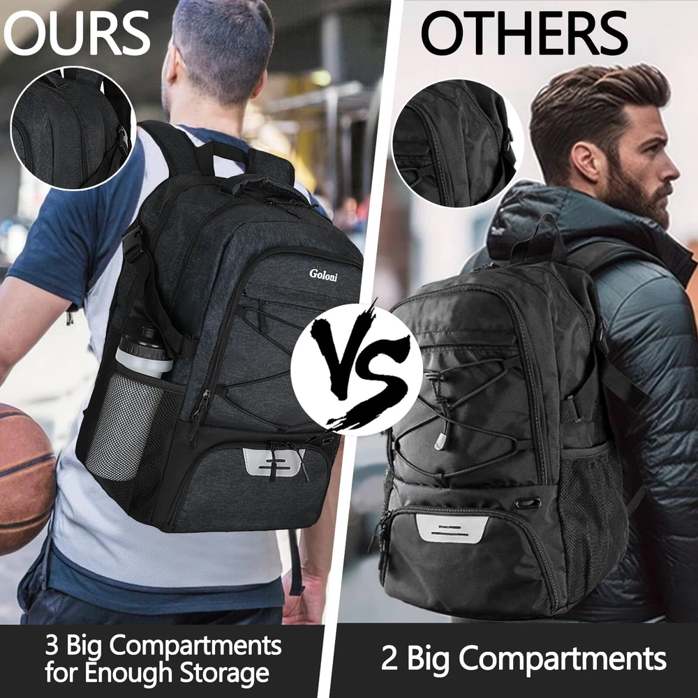 【Fabric】: The basketball backpack is made of durable 100% polyester material,water-resistant.reinforced stitching provide strength and durability for sports enthusiasts,multifunctional and easy to clean 【Large Capacity】:Basketball bag keeps everything organized and in one spot,ball,clothes,water bottle,key,wallet,shoes,even your laptop 【Padded Shoulder and Back】:Padded parts provide comfortable carry,great reduce pressure for shoulder and back from the back pack 【Full-size Ball Compartment】:Big ball compartment for basketball,football,volleyball,can use as soccer backpack,tennis backpack,work or daily use 【Attention】: If this sports bag is equipped with tennis rackets, it will be somthing crowded to carry football or basketball. Please with us if you have any doubt with our backpack, we will be there for help