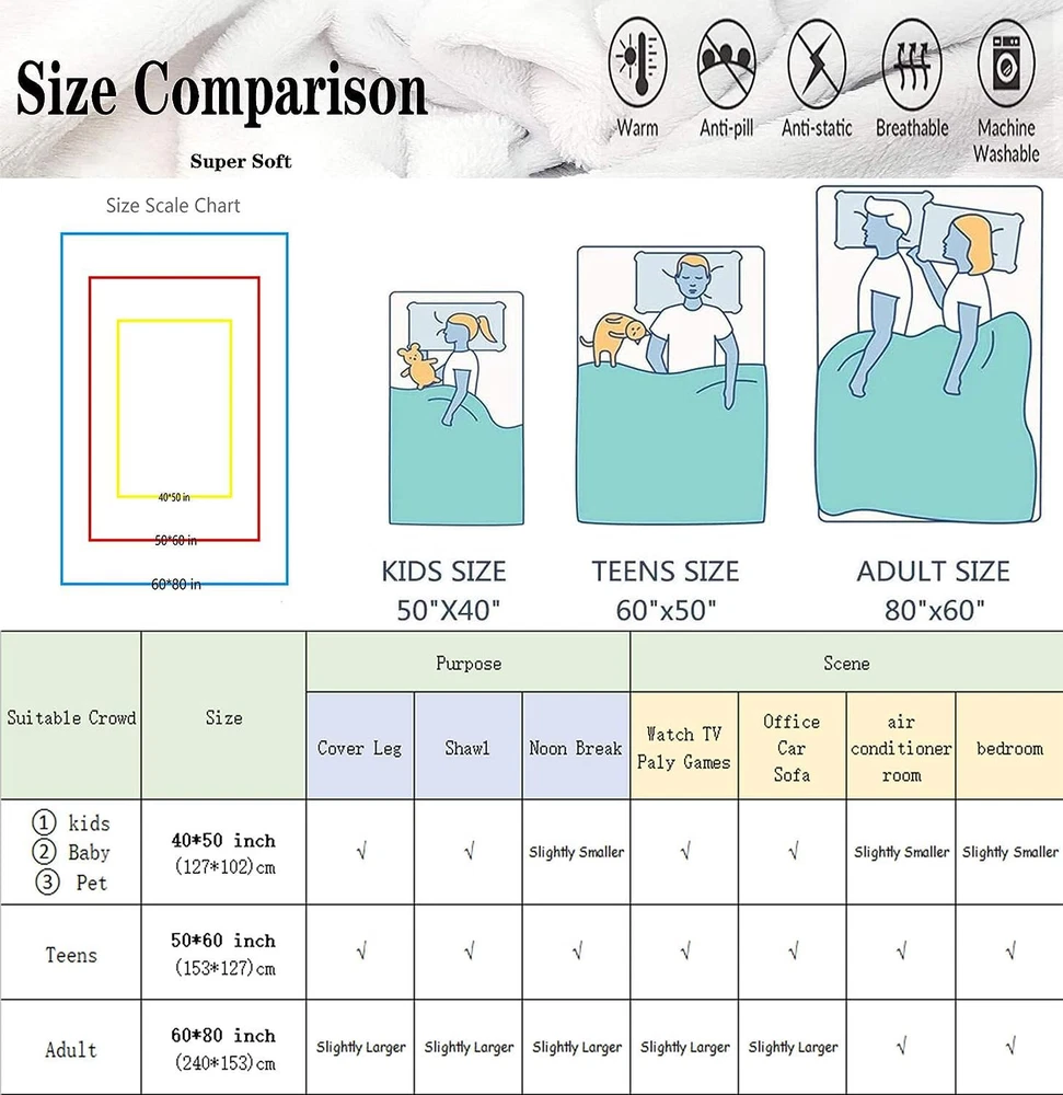 Fleece Throw Blanket for Sofa or Bed Throw Size, Soft Fuzzy Plush Blanket, Luxury Flannel Lap Blanket, Super Cozy and Comfy for All Seasons Strong Stitching Strong integrated Stitched edges stays there forever, does not unravel. Made to not shed any extra fabric . Built to last and provide durability. Soft-Touch Micro Fleece Our throws are produced from micro fleece making them incredibly soft and perfect for helping keep you warm and cosy. All Season Chioce The Best Material: Flannel Fleece Blanket Do Not Absorb Water And Are Light, Making Microfiber Lightweight Yet Extremely Warm, Breathable, Hyposensitive, Soft, Silky, Lightweight And Durable; Microfiber Ensures Long Term Use And Resistant To Shrinking/Wrinkling. Keeps Its Shape Over Time. Large And Cozy: We offer children's throws(40"x50"), blankets for teens(50"x60"), and queen size blankets for adults or bed sheets (60 "x80") with different colors such as floral horse,wolf,sunflower,American Flag,watermelon,music note,alpaca llama,American Eagle,cartoon panda,rainbow butterfly and so on. All Seasons Suitable: Fleece Blanket for couch or bed is perfect for decorating the home - The fabulous color revives this blanket with an elegant appearance to complement your room with a chic feeling - Protect your luxury bed and couch from dirt and stain to keep them fresh and clean. Multiple Purposes: The Blanket Is Perfect For Daily Use Both Indoor And Outdoor.A great addition to your bedding collection - sofa, couch, bedroom, living room, office,guest room, kids room, RV, vacation house. It is also perfect use for family outdoors activity, camping, backpacking,sports and beach. Perfect Gift: The Throw Blanket Also An Excellent Birthday Gift ,Mother'S Day Gift,Father'S Day Gift ,Halloween Gift, Thanksgiving Gift And Christmas Gifts For Friends Children, Parents, Grandparents And Dad Mom.