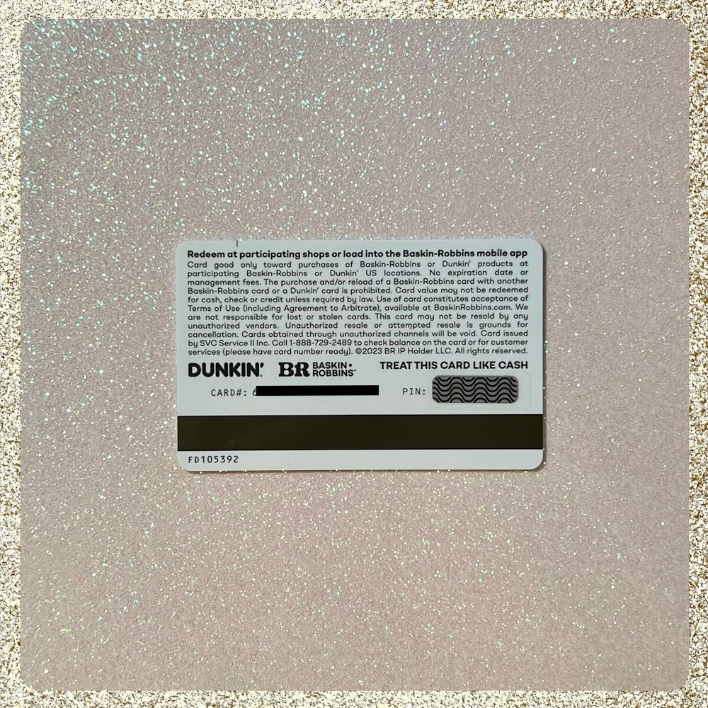 This listing is for a Baskin Robbins/Dunkin Pink Spoons Gift Card. The card is brand new with the PIN still intact. It has no stored value at this time, but you can load money to the card at a Dunkin/BR store or on the app. Buy with confidence. If I didn't have to provide tracking, I wouldn't charge for shipping.