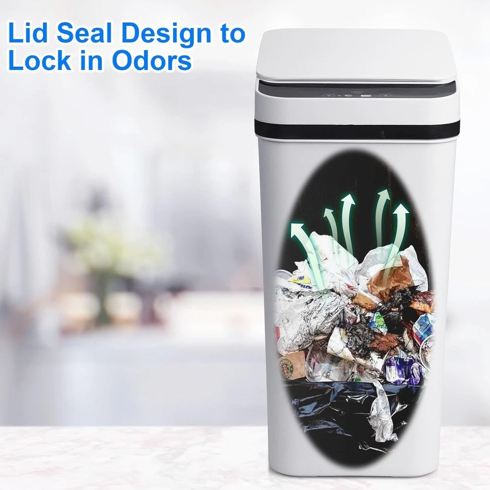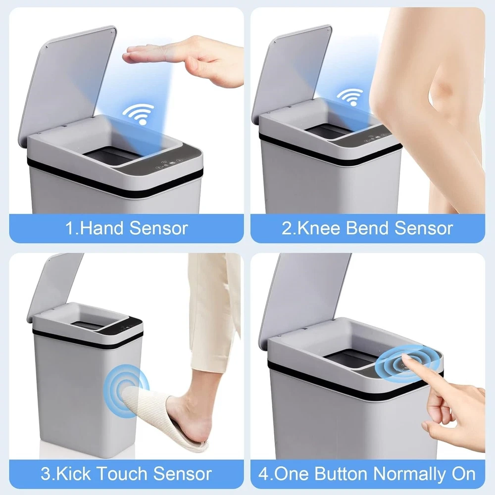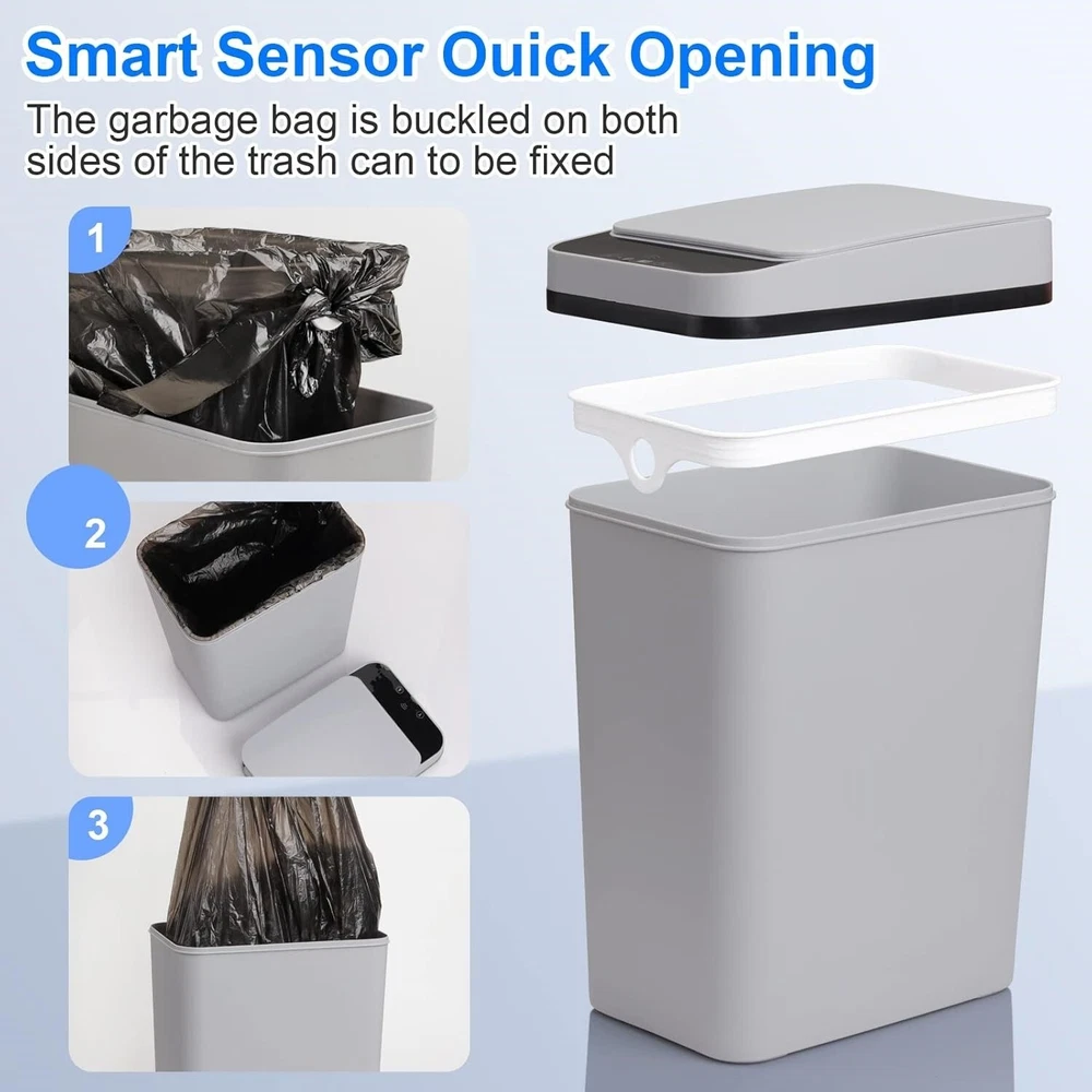 Basurero De Baño Con Tapa, Bote De Basura Automático Sin Contacto De 2.2 Galones Botes de basura pequeños: el bote de basura de inducción de 2,2 galones es adecuado para espacios estrechos de baños pequeños y se verá más pequeño; si le importa, compre otros botes de basura más grandes. Diseño de tapa sellada, sensor sensible: el bote de basura sin contacto usa tecnología infrarroja para ahorrar batería, funciona con 2 baterías AA (no incluidas) y, al mismo tiempo, usa materiales a prueba de agua y humedad, no afectará su uso en el baño. Material de alta calidad, fácil de limpiar: el bote de basura de baño sin contacto está hecho de excelentes materiales plásticos como ABS + PP, la superficie es resistente y lisa, puede eliminar fácilmente la suciedad en la superficie del bote de basura con solo un toque. Ahorre espacio en casa y controle la propagación de olores: el bote de basura de baño ultrafino con una capacidad de 2,2 galones ahorra espacio y es ideal para espacios limitados o grietas estrechas. Después de probarlo, este bote de basura tiene muy buena hermeticidad y puede sellar el olor de la basura. Es el compañero perfecto en tu hogar. Fácil de instalar las bolsas de basura y diseño silencioso: la tapa del bote de basura con movimiento para baño es extraíble, lo que te permite colocar y sacar la bolsa de basura cómodamente. La tapa se abre y se cierra silenciosamente y no afectará a quienes te rodean. Un anillo de cubo desmontable puede fijar firmemente la bolsa de basura y no hará que se resbale. Recordatorio importante: la tapa de manos libres de este bote de basura se abre en 0,1 segundos y se cierra automáticamente después de 5 segundos de permanencia. Si necesitas abrir el bote de basura durante mucho tiempo, puedes presionar manualmente el botón hacia arriba; después de usarlo, presiona manualmente el botón hacia abajo para cerrar el bote de basura.