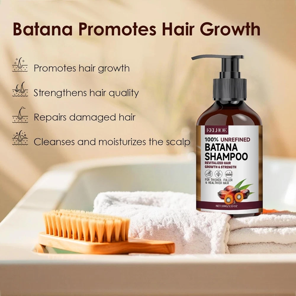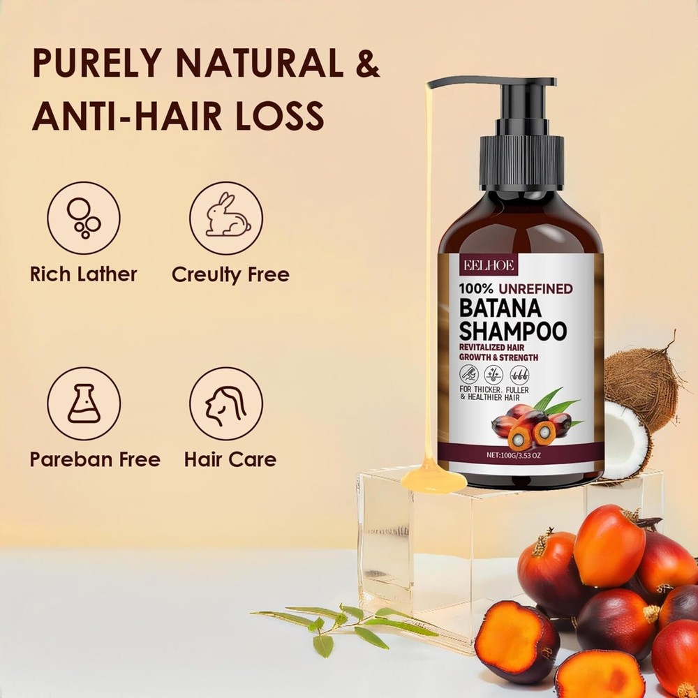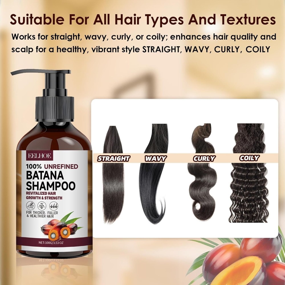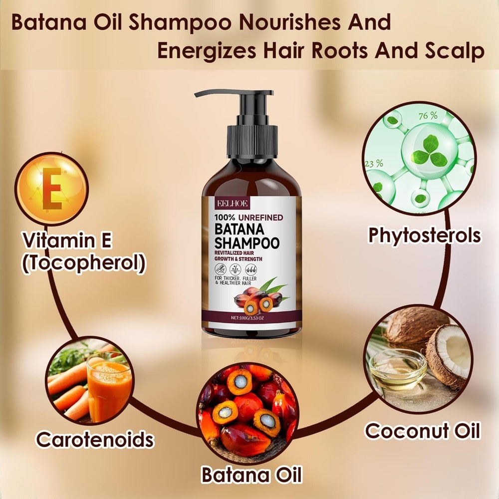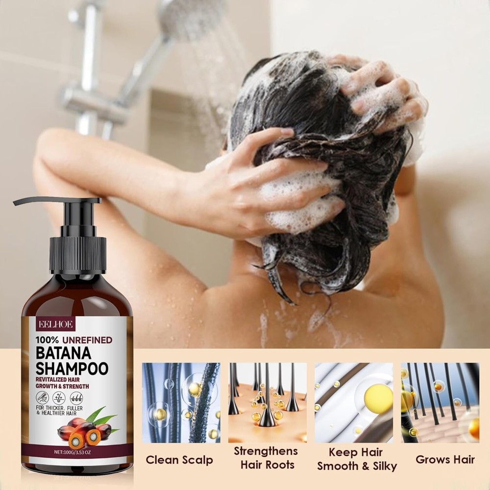 Batana Oil Shampoo for Hair Growth, Strengthening & Regrowth Formula for Men & Women, Reduces Hair Loss, Promotes Thicker Hair, Suitable for All Hair Types, 3.53 Fl Oz/100ml (pack of 1) NOURISHES & REPAIRS HAIR: Our Batana Oil Shampoo and Conditioner are infused with Batana Oil, a rich source of oleic acid that deeply nourishes and revitalizes hair, strengthens hair roots, repairs damaged hair, promotes healthy hair growth, and enhances natural shine PROMOTE HAIR GROWTH: Enriched with Batana Oil, Coconut Oil, and Lemon Extract, Batana Oil Shampoo and Conditioner deeply nourishes each strand and promotes hair growth. This powerful blend of ingredients works synergistically to provide intense moisturization, improve hair texture, and promote stronger, thicker hair over time NATURAL GENTLE CLEANSER: Your hair will look smoother with every use of Batana Oil Shampoo. Over time, you'll be surprised to see less fine hair and breakage on your scalp, giving you thicker, bouncier hair FOR ALL HAIR TYPES: Made with premium natural ingredients and free of any hair-damaging chemicals, our conditioners ensure your hair care routine is safe and eco-friendly, suitable for both color-treated and chemically treated hair FAMILY WITH HAIR LOSS: Our hair growth shampoo is suitable for both men and women. A thoughtful gift for friends and family with thinning hair or hair loss. Feel their work every time you wash your hair, leaving it feeling light and refreshed. Note: This Product is designed to deliver optimal results, offering high-quality performance and satisfaction. Please note that individual experiences and outcomes may vary based on personal use, preferences, and unique circumstances. For best results, we recommend following the provided guidelines and ensuring the product is used as intended. Product result may vary for every individual. Batana Oil Shampoo - B0DP2PTMC8