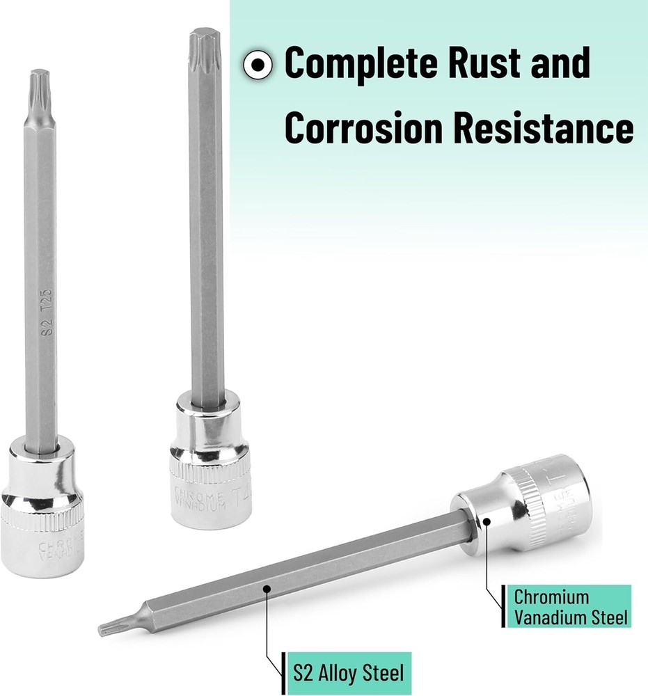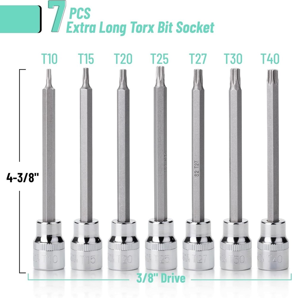 Bates Extra Long Torx Bit Socket Set 7 Pieces 3/8" Drive T10-40 4-3/8" Long Drive System: Torx Finish Type: Painted Number of Pieces: 7 Bates extra long Torx bit socket set includes 7 pieces, providing a comprehensive range of Torx sizes from T10 to T40, making it perfect for a variety of fastening tasks. Constructed from high-quality materials, these sockets are built for durability and reliability, ensuring they stand up to heavy-duty use. Featuring a 3/8" drive and 4-3/8" long design, these sockets are specifically designed to reach deep, hard-to-reach fasteners, making them ideal for tight spaces and tough jobs. Perfect for automotive repairs, electronics, and professional maintenance, this set is a must-have for anyone needing precision and reliability in their tools. The set comes in a sturdy, organized case, keeping your sockets secure and easy to access, so you can find the right tool quickly every time. Return Policy: We offer a 30 day return policy from the receiving date. Please contact us for a Free Return Label. Please use our return label so it will go back to our supplier and we can do a refund or replacement afterwards. Feedback: Your satisfaction is very important to us! If you have any problem with your order, please contact us and we will do our very best to make you satisfied. As long as you are happy with your purchase, please leave a positive feedback for us. We will always leave you a positive feedback in return. If you have any problem with your purchase, please do not leave a negative feedback. Please Contact us ... and your issue will be solved quickly and positively We are a small family-owned business trying to make a living, not a huge company that does not care ... We will ALWAYS do our best for you!