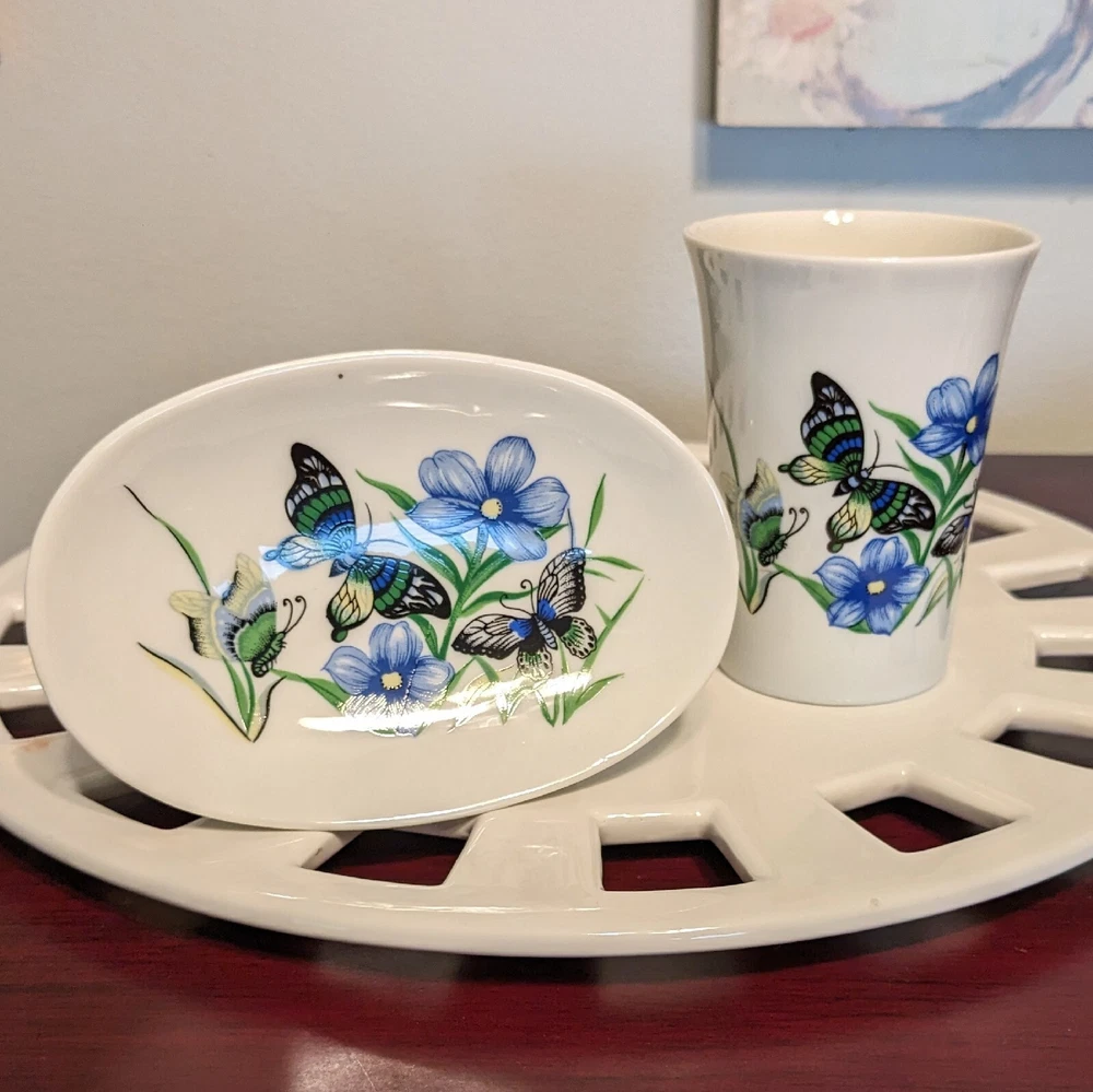 New In Box Bathroom Tumbler Brush Holder & Soap Dish Flowers Butterflies VTG NOS. New in a vintage box and unused. Opened to photograph the pieces. Pretty scene with blue flowers and butterflies.