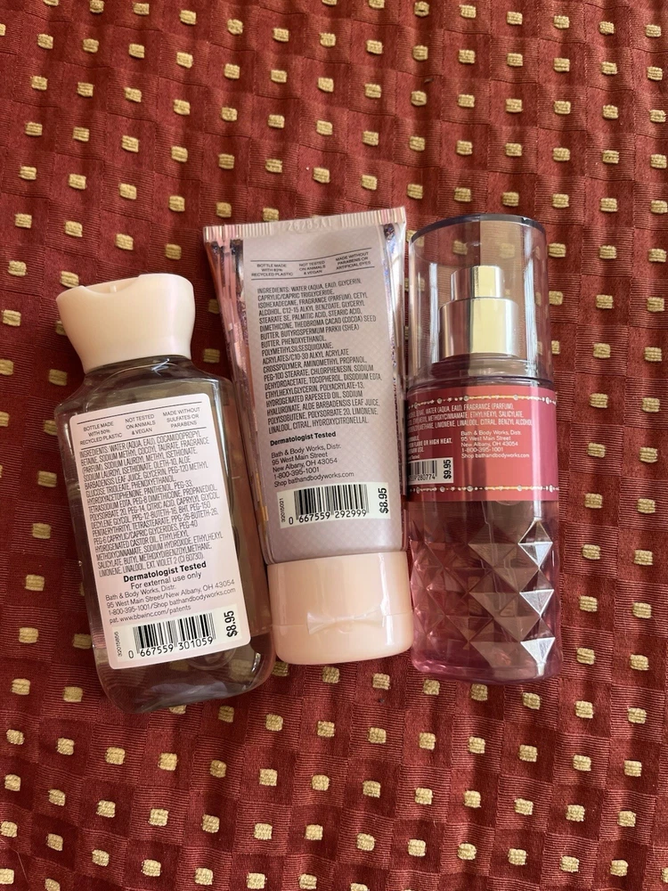 Shape:naType:Travel SetGender:WomenBundle Description:3 PC Set Gift SetSet Includes:Body Mist, Lotion, Shower GelDepartment:WomenIngredients:Aloe, Vitamin EPattern:naSize:Travel SizeCountry/Region of Manufacture:United StatesCustom Bundle:YesColor:MulticolorBrand:Bath & Body WorksFeatures:Animal Cruelty-FreeMPN:Does Not ApplyProduct Line:Bath & Body WorksFormulation:Gel, Lotion, SprayScent:CHAMPAGNE TOAST