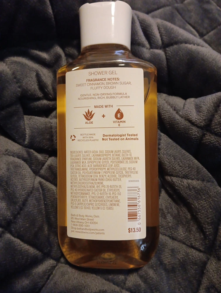 Body Area:BodyVolume:10 fl ozType:Shower GelSize:RegularBrand:Bath & Body WorksFormulation:GelScent:Cinnamon Donut SwirlDepartment:UnisexIngredients:Vitamin E, Aloe
