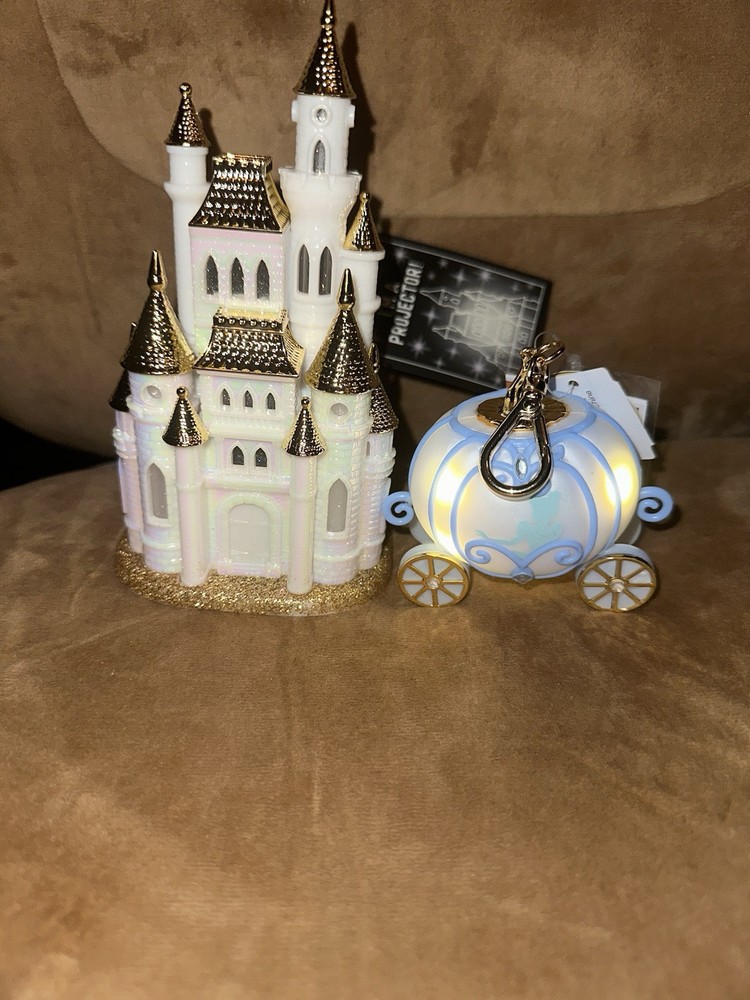 This listing is for a Disney Princess Castle wallflower plug. It is a projector. Also included is a Pocketbac hand sanitizer holder that is shaped like Cinderella’s carriage. It lights up when you press the button. They are new never used and will be boxed well to keep them safe during shipping.