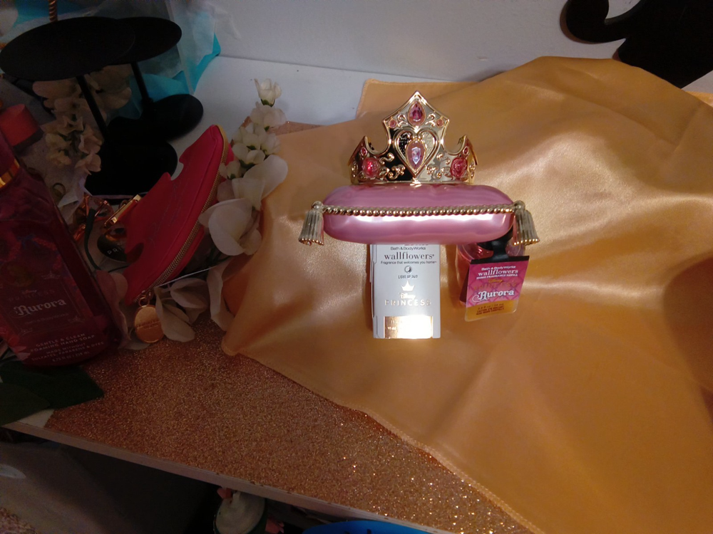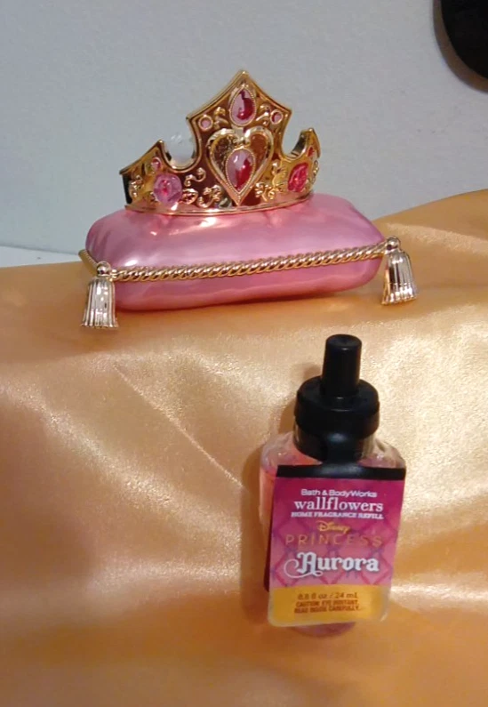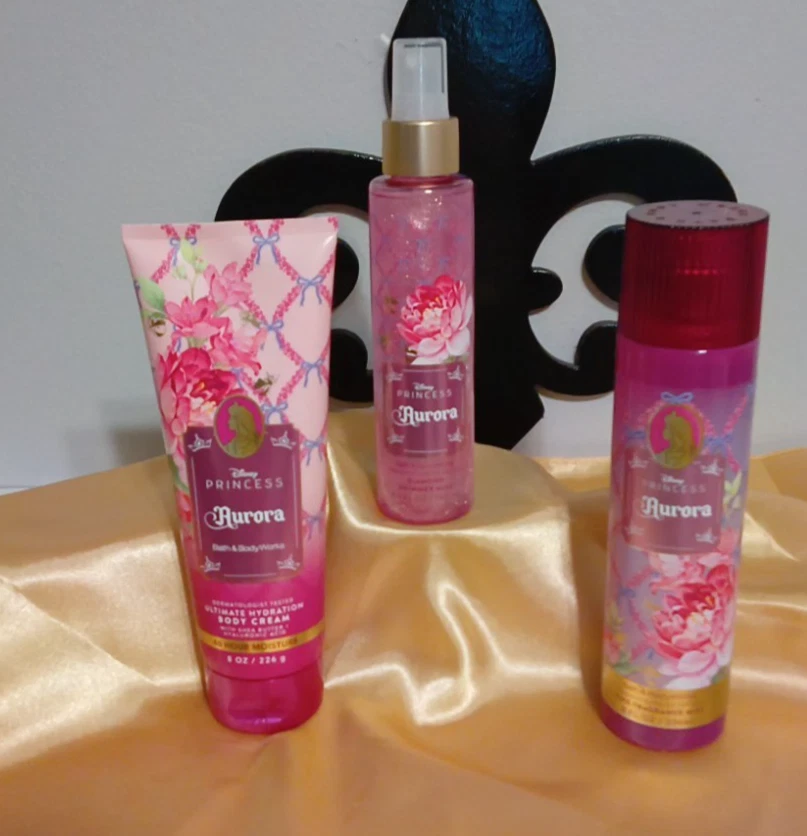 Bath& Body works With Disney Princess Collection Back! Limited Time Edition Aurora With the Scent of : soft rose petals, sandalwood dreams and sparkling fairy dust. Gift Set Comes w ith 3 wick Candle Wallflower plug in with refill Ultimate Hydration Body Cream , Body Wash 10 oz Fine Fragrance Mist 8 oz, Diamond Shimmer mist 4.9 oz Coin Purse & lip gloss Hand Soap 8.75 oz Hand Sanitizer & Pocketbac holder Dont miss this Collection please ask any questions Happy Shopping