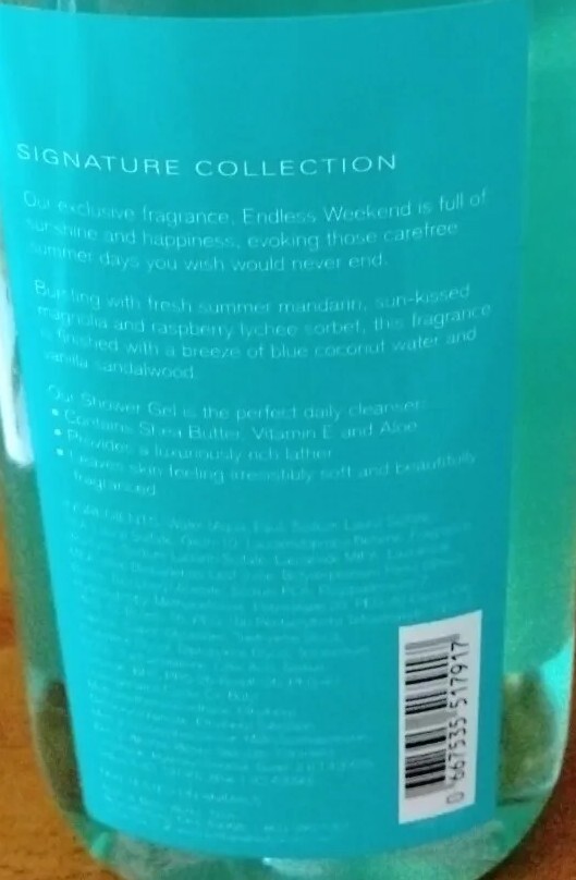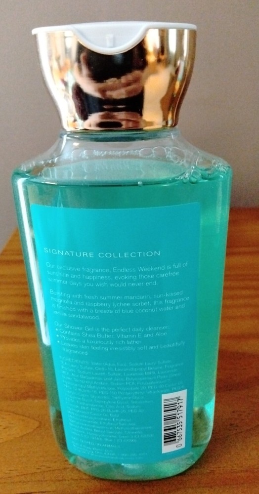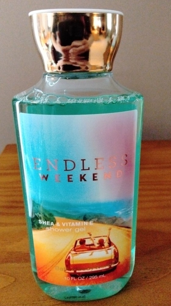 Brand:Bath & Body WorksDepartment:UnisexModel:Endless WeekendSize:Standard SizeFormulation:GelVolume:10 fl ozIngredients:Shea ButterCountry/Region of Manufacture:United StatesType:Shower GelProduct Line:Bath and Body worksUPC:Does not applygtin13:Does not apply