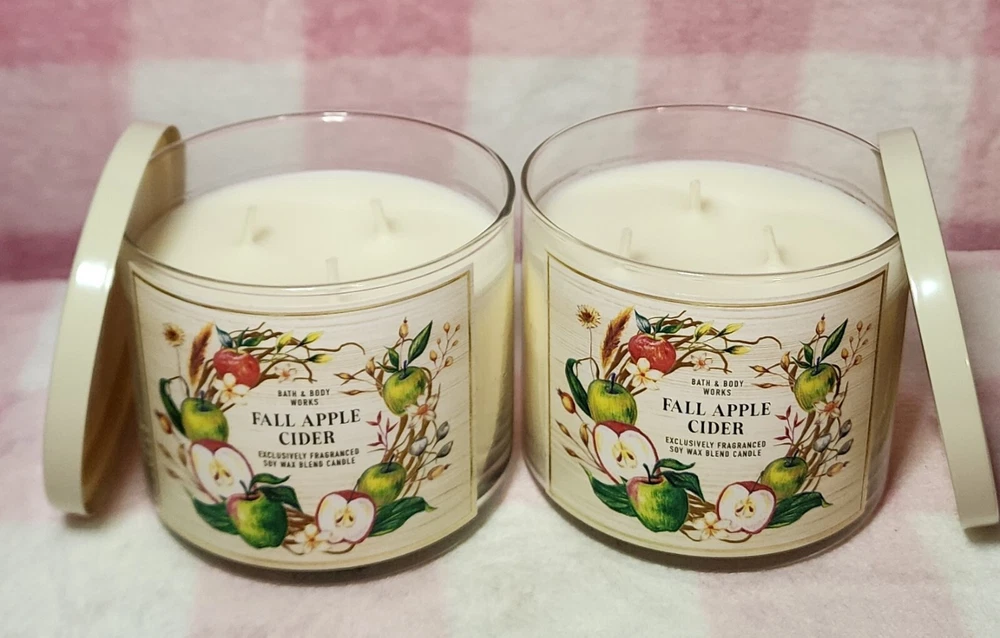 Hard to find no longer sold three wick (14.5 oz) candles, set of two, in "Fall Apple Cider" scent. Never burned or warmed. Not responsible for wax shifts in transit- please view all photos as this is the exact item you will receive. Ships with care next business day from smoke-free home.