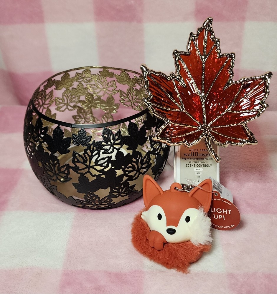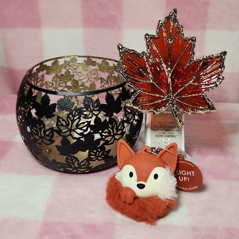 πŸ‚ Bath & Body Works Fall Themed Gift Set- NEW πŸ‚ Brand new, no longer sold three wick leaves silhouette candle holder, scent control night light Maple Leaf Wallflower Plug, and light-up frolicking fox pocketbac sani holder- all BNWT. Ships with care from smoke-free home.