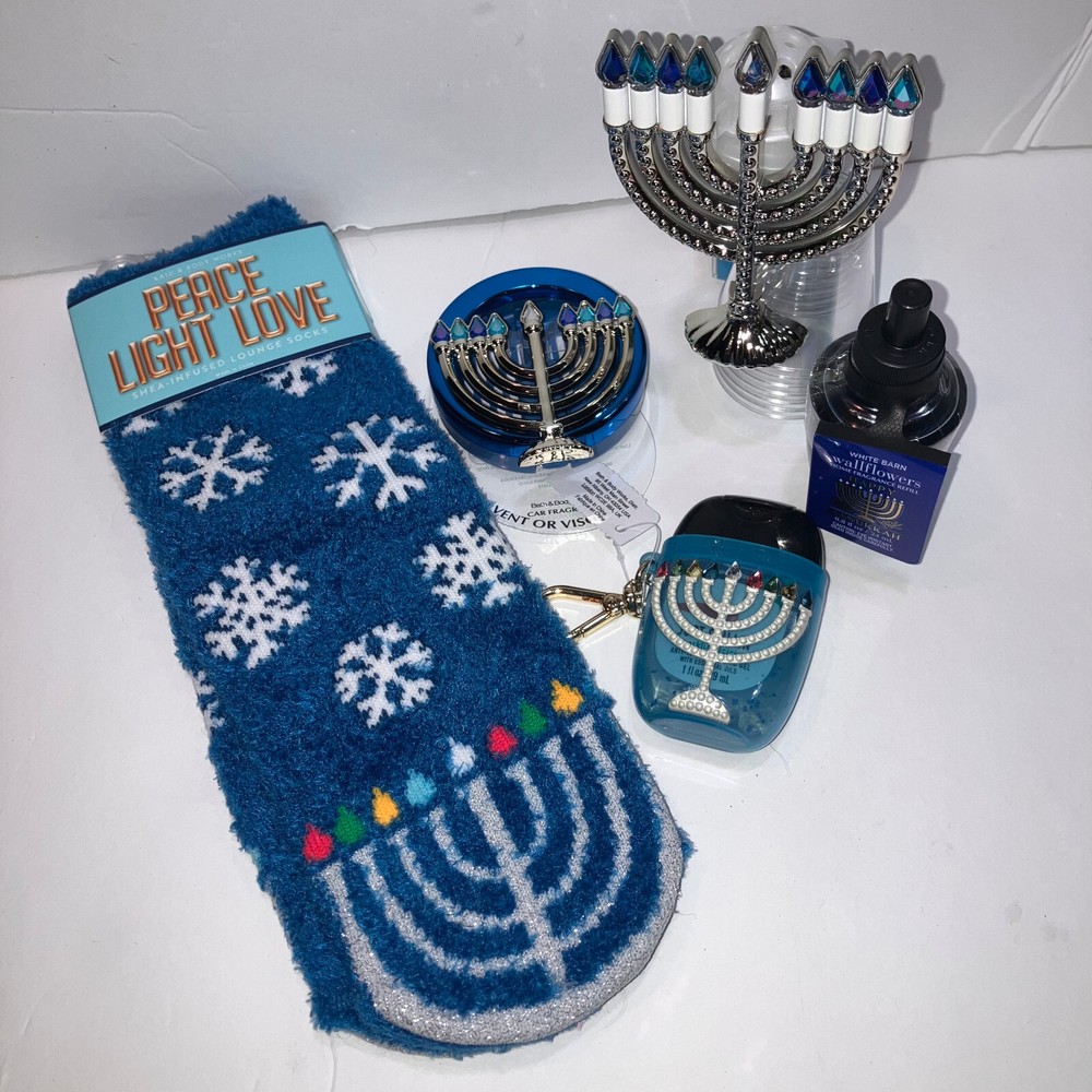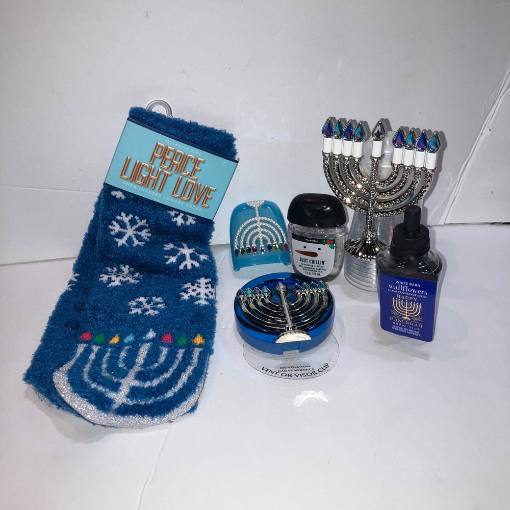 Bath & Body Works Hanukkah 7pc Gift Set includes: Peace Light Love shea infused lounge socks one size fits most Menorah nightlight Wallflowers plug Happy Hanukkah Wallflowers refill bulb (pillowy fried donut and sweet jelly filling sprinkled with powdered sugar) Menorah Pocketbac Holder Sparkling Icicles Pocketbac Hand Sanitizer Menorah Scentportable Vent/Visor Clip NOT PICTURED: Scentportable refill disc scent may vary All products New With Tags!