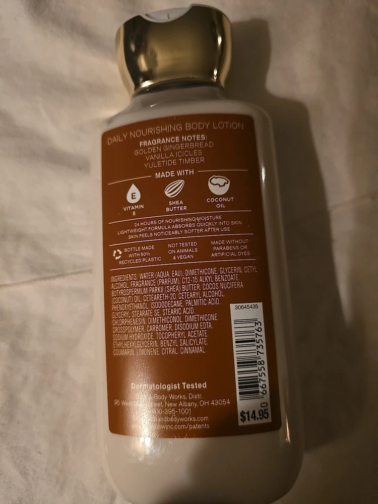 Type: Daily Use Active Ingredients: Vitamin E, Shea, butter, coconut oil Body Area: Full Body Size: Regular Product Line: Bath and body Scent: Jolly gingerbread village Main Purpose: Moisturizer Volume: 8 fl oz Country/Region of Manufacture: United States Brand: Bath & Body Works Formulation: Lotion Department: Bath and body Ingredients: Coconut Oil, Shea Butter Color: Gold Features: Dye-Free, Paraben-Free Skin Type: All Skin Types