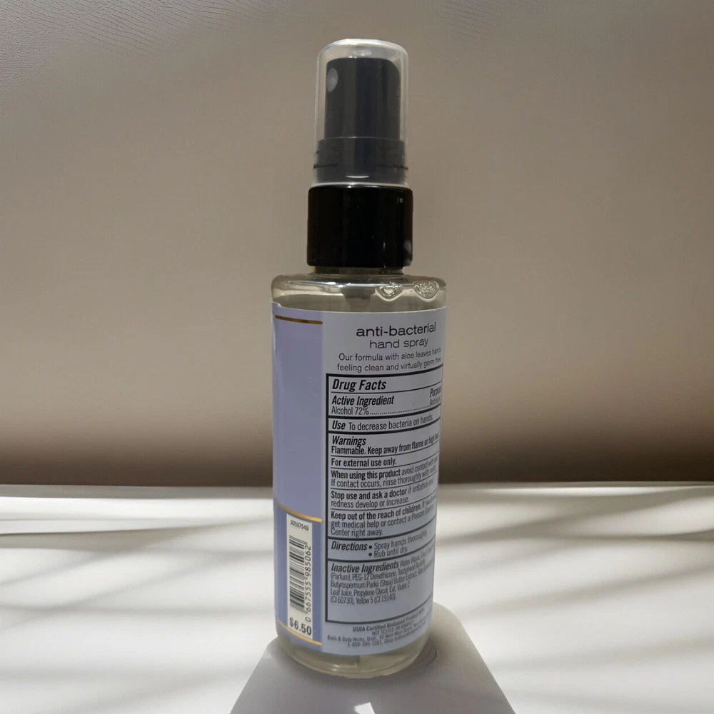 Formulation:SpraySize:RegularIngredients:EucalyptusScent:Lavender & VanillaUPC:Does not applyBrand:Bath & Body WorksItem Weight:3 ozFeatures:Antibacterialgtin13:Does not applyBody Area:Hands