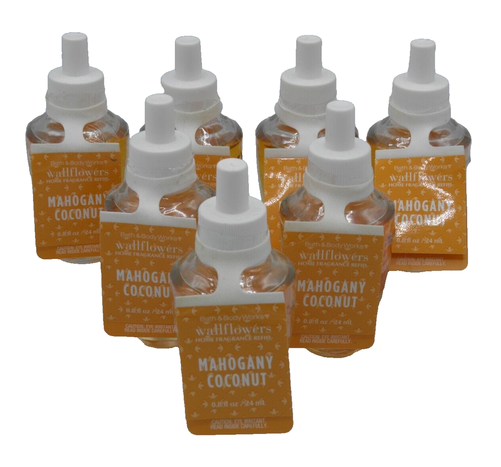 The Bath & Body Works MAHOGANY COCONUT WALLFLOWER REFILL BULB is a pack of 7 glass bulbs designed for wallflower plug-in air fresheners. Each bulb has a volume of .8 fl oz and is scented with a combination of mahogany and coconut. The bulbs are intended for use in a wall installation and are powered by a wall plug-in source. Mailing Address - We will ONLY ship to the address on file with eBay. This policy is in place for the protection of the buyer and seller. Before making a purchase, please ensure that your address is correct. We cannot change the address after purchase and will otherwise cancel the sale. Handling Time - Our handling time is set to THREE BUSINESS DAYS. We ship packages Monday - Friday, except on holidays . This listing is NOT sponsored by, affiliated with, or representative of the mentioned brand(s), trade name(s), or trademark(s) and does not claim any ownership of such. All trademarks or brands mentioned in this listing are registered trademarks of their original owners who reserve all their rights and ownership. The use or mention of any trade name, product name, or trademark is necessary for identification and is for reference purposes only.