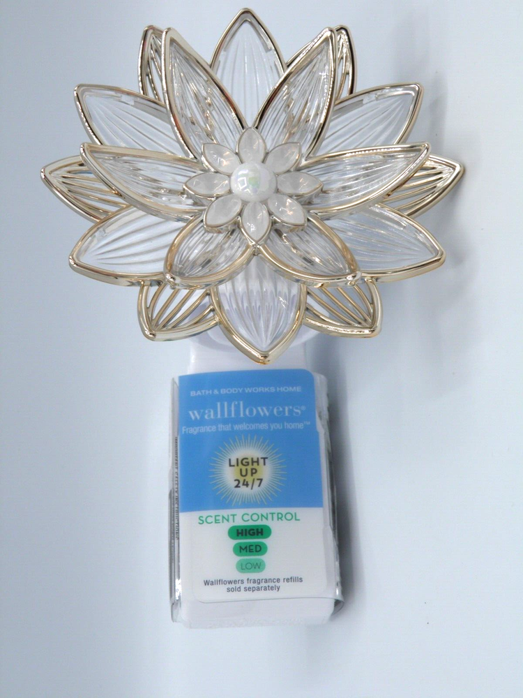 Intended Use: wallflower plug Installation Area: Wall Model: OPEN LOTUS NIGHTLIGHT SCENT CONTROL Wallflower Theme: OPEN LOTUS NIGHTLIGHT SCENT CONTROL Wallflower Material: Plastic UPC: Does not apply Type: wallflower diffuser LIGHT-UP Features: Diffuser, Scent Control, Nightlight gtin13: Does not apply Color: Multicolor Power Source: Wall Plug-In Number in Pack: 1 Brand: Bath & Body Works Style: Traditional Pattern: Open Lotus Flower