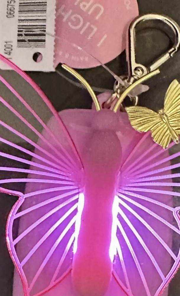 This Bath & Body Works pocketbac holder is designed with a Pink Butterfly pattern, featuring a light-up Butterfly accent. The pocketbac holder is a one size unisex accessory made of plastic material, perfect for carrying hand sanitizers. The multicolor design and Butterfly theme make it a stylish and practical accessory for keeping your hand sanitizer easily accessible on the go.
