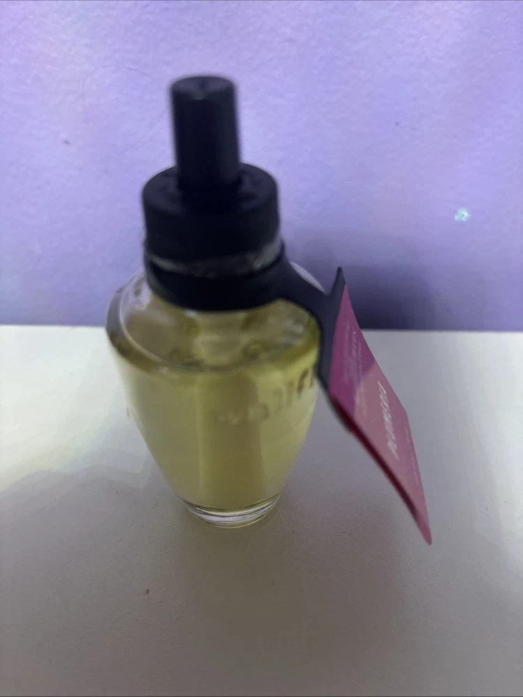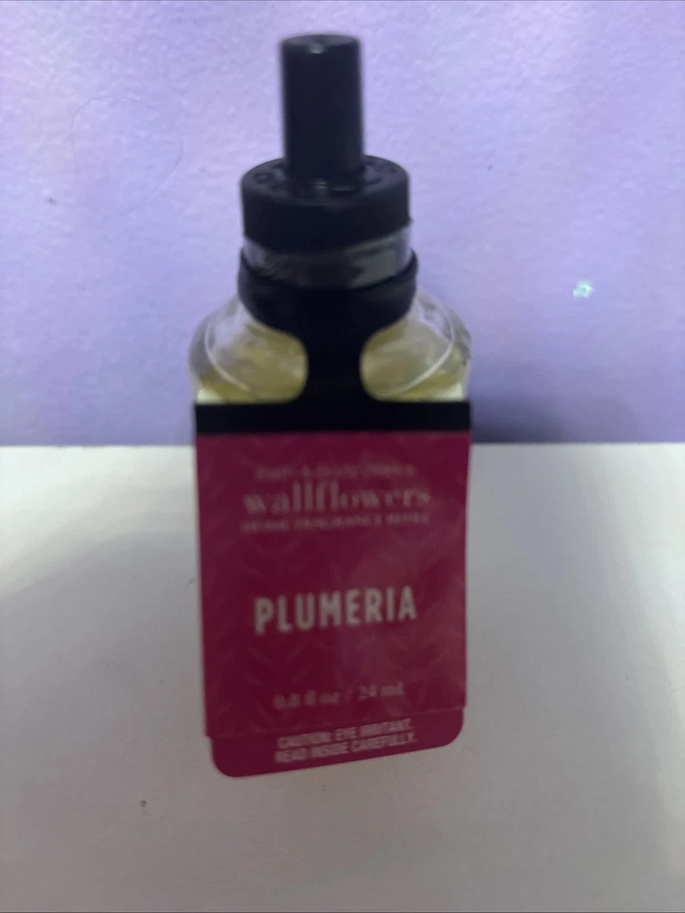 This is a Bath & Body Works Plumeria Wallflower Refill, designed for adults. It comes in a glass bottle and contains scented oil in a multicolor shade. The refill is intended for use with a wallflower plug-in air freshener to add a pleasant fragrance to your home.