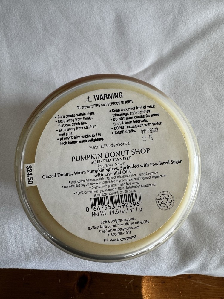 Room: ANY ROOM Theme: Holiday, Fall MPN: 44e-333 Country/Region of Manufacture: United States Features: Multiple Wicks, Scented Number in Pack: 1 Power Source: 3 WICK CANDLE Brand: Bath & Body Works Shape: Round Customized: No Item Width: 4 in Handmade: No Burning Time: Approximately 25-45 Hours Material: Glass, Wax Size: Large Model: Large 3 Wick 14.5 oz Style: Traditional Personalize: No Scent: Pumpkin Donut Shop Type: Jar/Container Candle Color: White Item Height: 3.5"