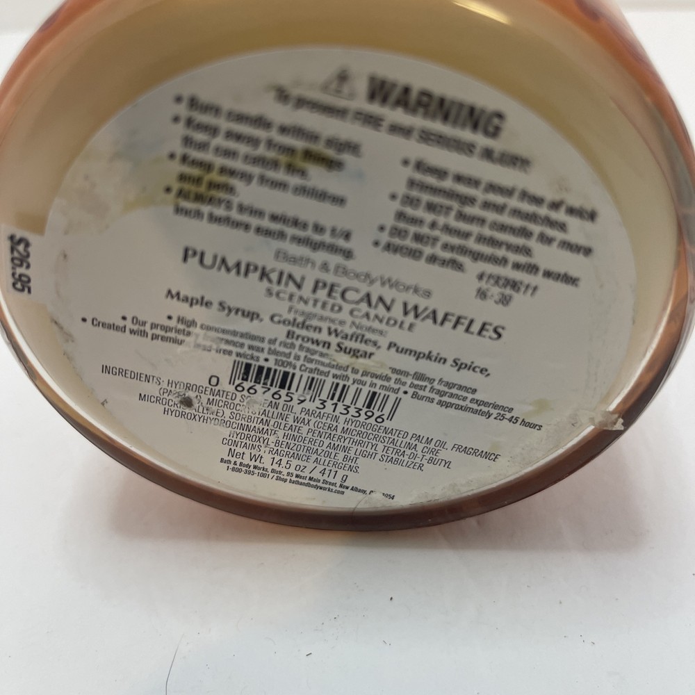 Theme: Seasonal Brand: Bath & Body Works gtin13: Does not apply Color: White Country/Region of Manufacture: United States Handmade: No Features: 3 Wick MPN: 30606474 Style: Modern Number in Pack: 1 Shape: Jar Item Weight: 14.5 Material: Soy Wax Burning Time: More Than 5 hrs Scent: Pumpkin Pecan Waffles UPC: Does not apply Room: Any Room Size: Large Type: Jar/Container Candle