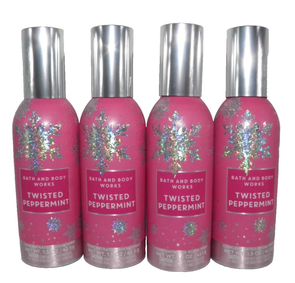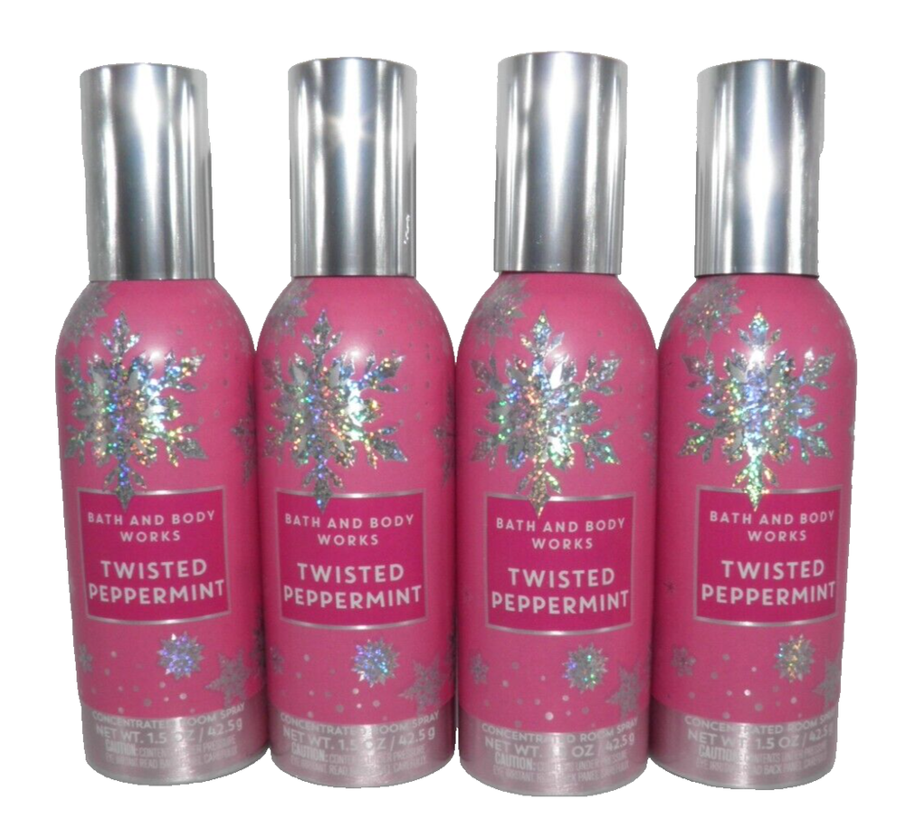 Number in Pack: 4 Product Line: Bath and Body Works Brand: Bath & Body Works Department: Unisex Scent: TWISTED PEPPERMINT Form: Aerosol Spray Volume: 1.5 fl oz Manufacturer: Bath and Body works Installation Area: Indoor Suitable For: Home MPN: TWISTED PEPPERMINT Type: Spray Room: All Features: Concentrated Container Type: Can