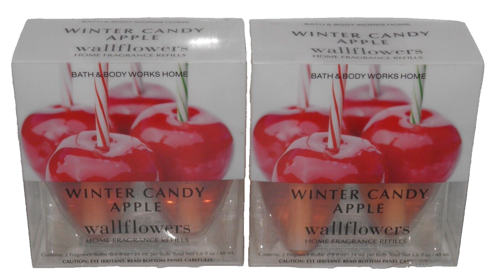 Type: wallflower diffuser Installation Area: Wall Brand: Bath & Body Works Features: Diffuser, ODER ELIMINATING FRESH SOURCE Scent: WINTER CANDY APPLE Power Source: Wall Plug-In Pattern: WINTER CANDY APPLE Number in Pack: 2 x 2 pack= 4 Bulbs Style: WALLFLOWER BULB gtin13: Does not apply UPC: Does not apply Form: Oil Intended Use: wallflower plug Material: Glass Model: WINTER CANDY APPLE