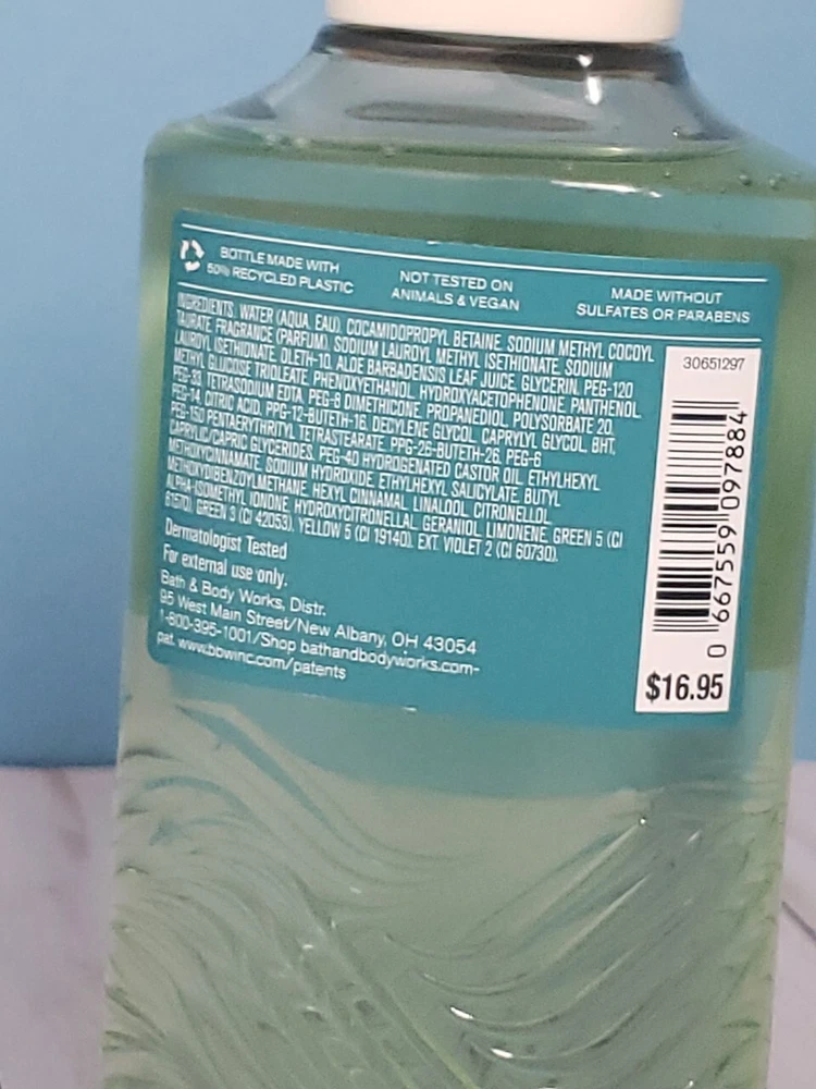 Formulation:GelVolume:10 fl ozColor:GreenMPN:does not applyUPC:Does not applygtin13:Does not applySize:RegularDepartment:WomenCountry/Region of Manufacture:UnknownType:Body WashBody Area:BodyProduct Line:Bath & Body Works Water Lily Springs Body WashSkin Type:Normal SkinFeatures:HydratingBrand:Bath & Body WorksScent:FreshIngredients:Mention in description