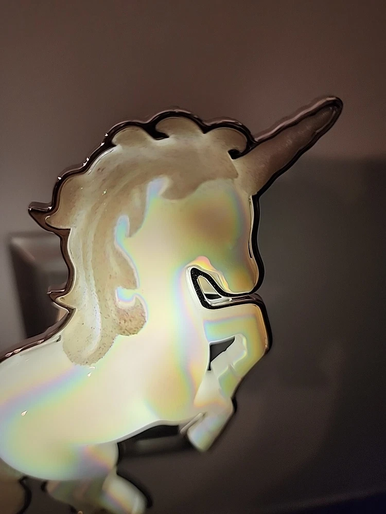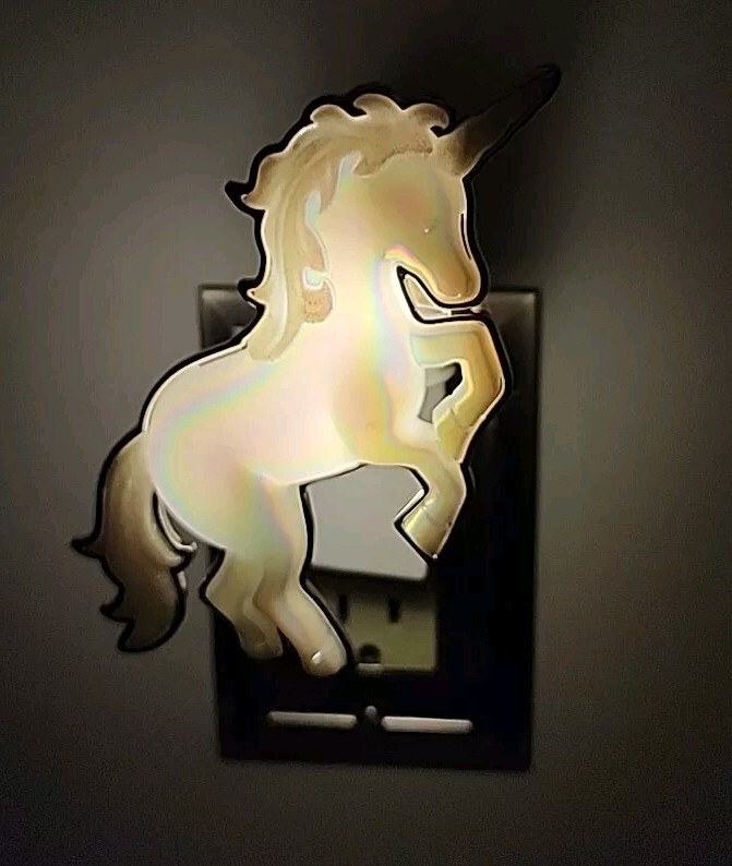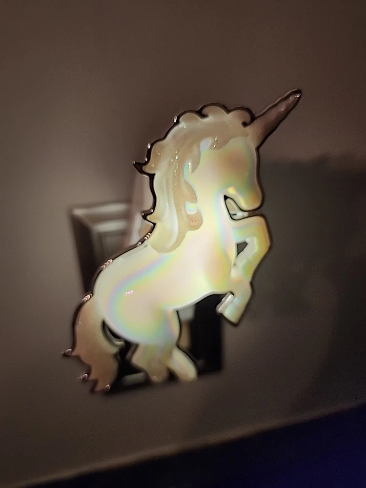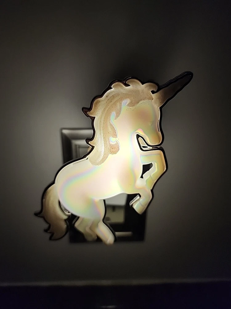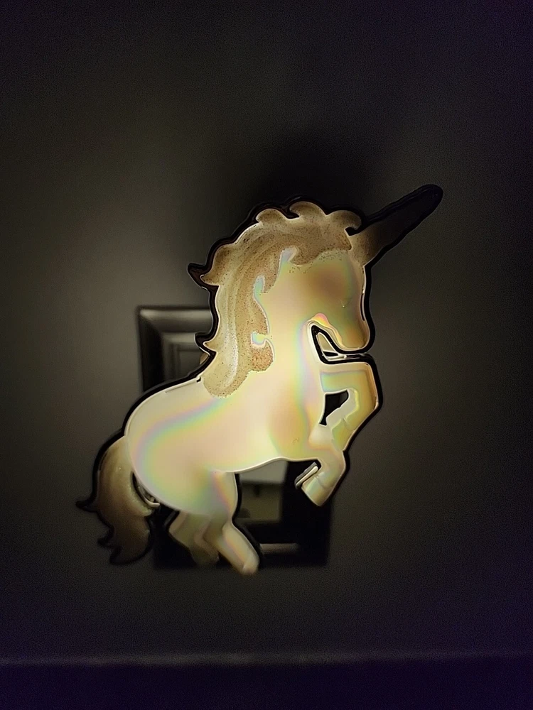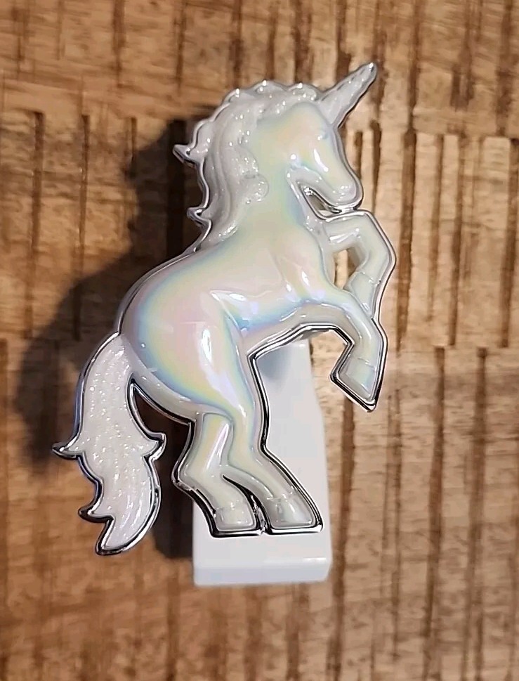 The Bath & Body Works Wallflowers Iridescent Unicorn Plug In is a small, white wall plug-in device designed to provide a fantasy-themed touch to any room. This Wallflower bulb plug features a glossy finish and a plastic construction with a decorative unicorn design that lights up when in use. It serves as both a diffuser and deodorizer, emitting a scented fragrance that helps eliminate odors and create a pleasant aroma for an aromatherapy experience. Perfect for adults, this whimsical Wallflower is ideal for adding a touch of fantasy and fragrance to your living space. All sales are final. No returns.