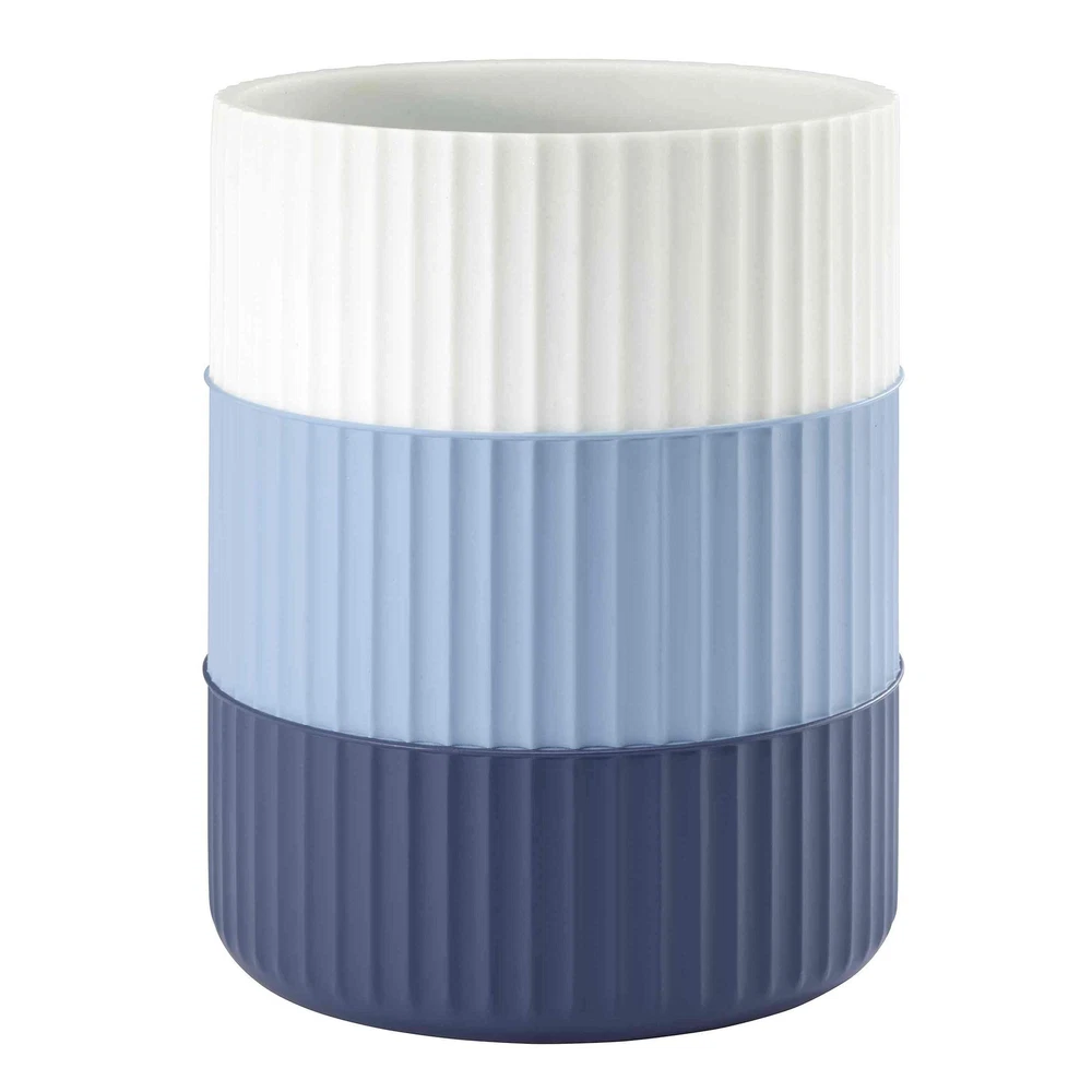 The Clubhouse Stripe Blue Wastebasket features a round, fluted design with 3 equal horizontal stripes of white, medium blue and navy. A great addition to any bathroom, bedroom or home office. Made of durable, hand-painted resin for easy-care and long-life, 8" L x 8" W x 10" H. INCLUDES: (1) Wastebasket QUALITY: 100% Resin CARE INSTRUCTIONS: Wipe with a damp cloth ADD STYLE ANYWHERE: A great addition to any bathroom, bedroom or home office. COLLECTION: Mix and match with other items from our collection!