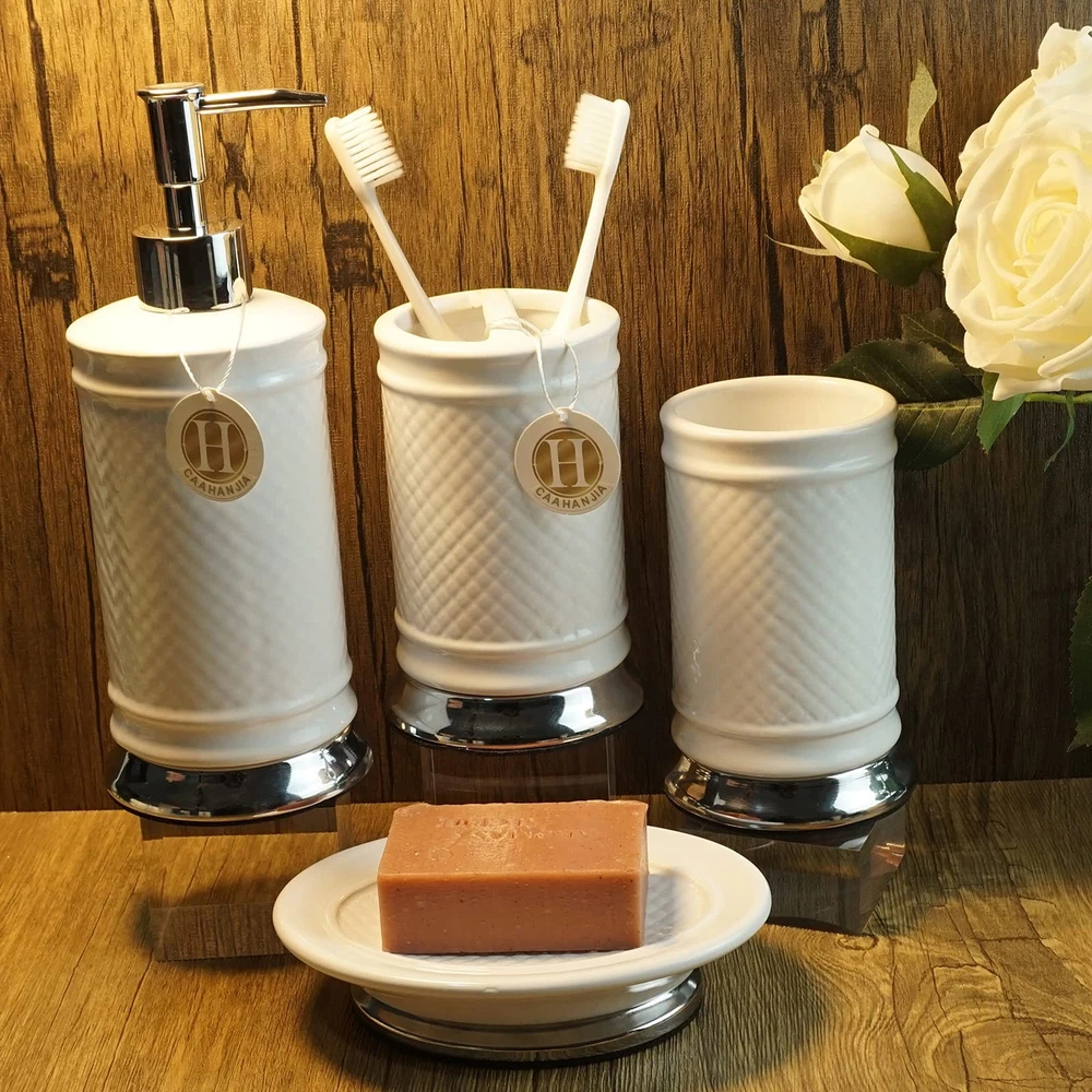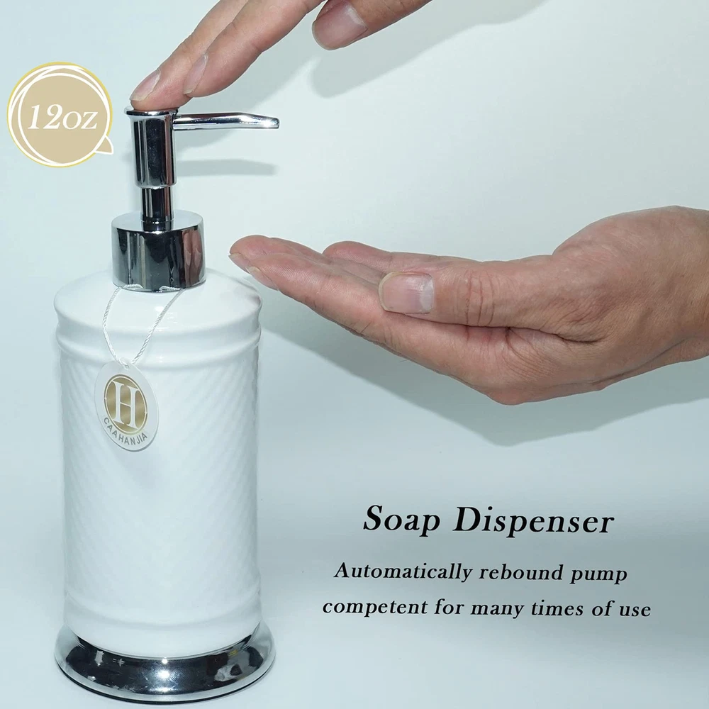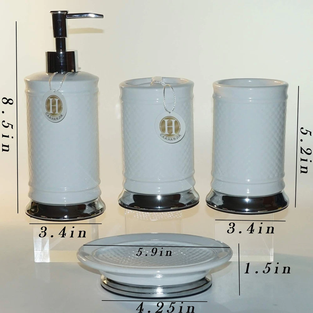 [Bathroom Set Material]: Ceramic bathroom accessories are made of high-quality porcelain clay and fired at high temperatures, which are safety, durable and easy-to-clean [Multi Functional]: Stylish design makes it ideal for modern bathrooms, this bathroom accessory set makes an attractive addition to any bathroom. It is suitable for homes, hotels, office buildings and other uses. [Bathroom Decoration Set]: Includes:1 lotion dispenser(ABS pump), 1 Toothbrush Holder, 1 tumbler cup, 1 soap dish [Great Gift]: As a perfect gift for your loved , family, friends and colleagues, it is the ideal choice for modern bathroom with its trendy design.