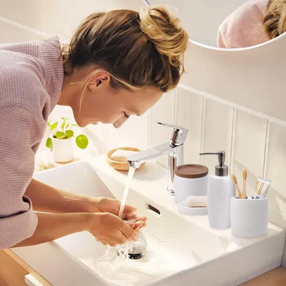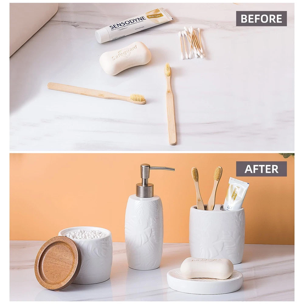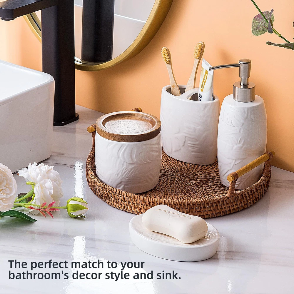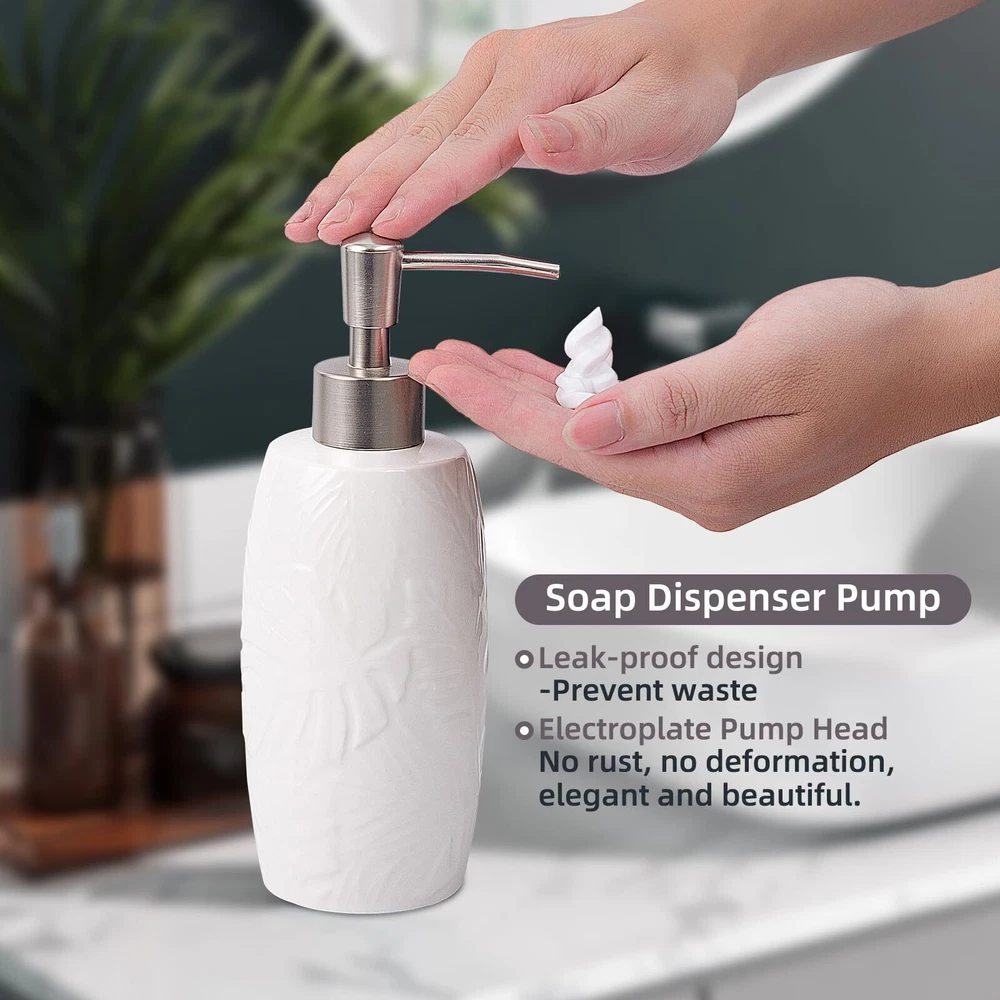 【4 Piece Bathroom Accessory Set】:Includes 1 x soap dispenser,1 x tumbler,1 x Cotton Jar, and 1 x soap dish. Organize and enhance your bathroom quickly and effortlessly. 【Embossed Designt】: The tropical leaves embossed design on a white ceramic body is unique and characteristic. The simple yet subtly decorative design could go well with various bathroom decoration styles. 【Large Cotton Jar】:Our apothecary jars with wood lids can decorate your powder room, bathroom vanity, makeup table, and more perfectly. It’s great for storing and organizing Q-tips, cotton balls, cotton swabs, cotton round pads, floss picks, hair timebands, makeup brushes, pens, clips, and more. 【Quality Soap Pump】:Our bathroom set accessories, exquisite fitting with a premium pump make it easy to squeeze out liquids, and fit tightly to prevent leakage. Also can prevent rust and last for a long time. 【High-Quality Ceramic Construction】: Each piece in this set is made from high-quality ceramic, ensuring durability, resistance to moisture, and a long-lasting finish that will maintain its beauty over time. leakage. Also can prevent rust and last for a long time. 【Easy to clean】:Wipe it with a soft cloth or just rinse it with water. The smooth surface feels nice to touch, there are no sharp or rough edges anywhere.
