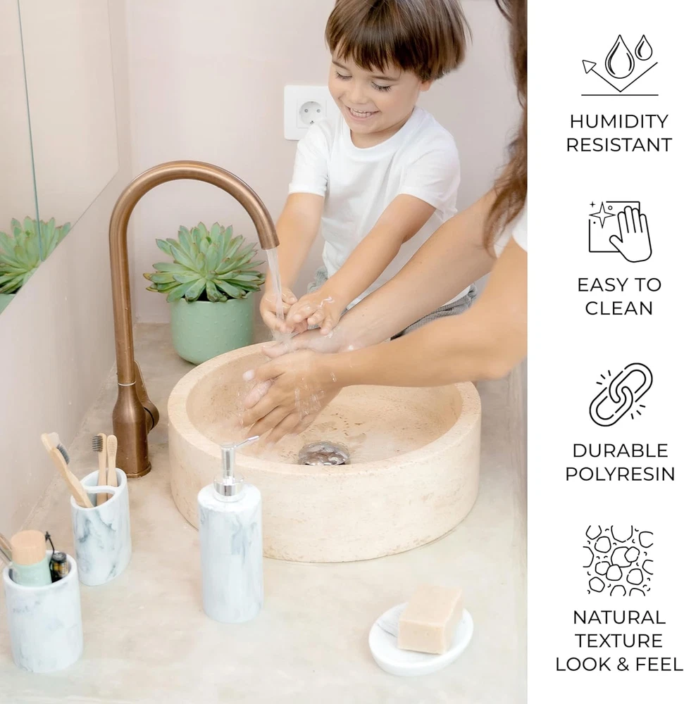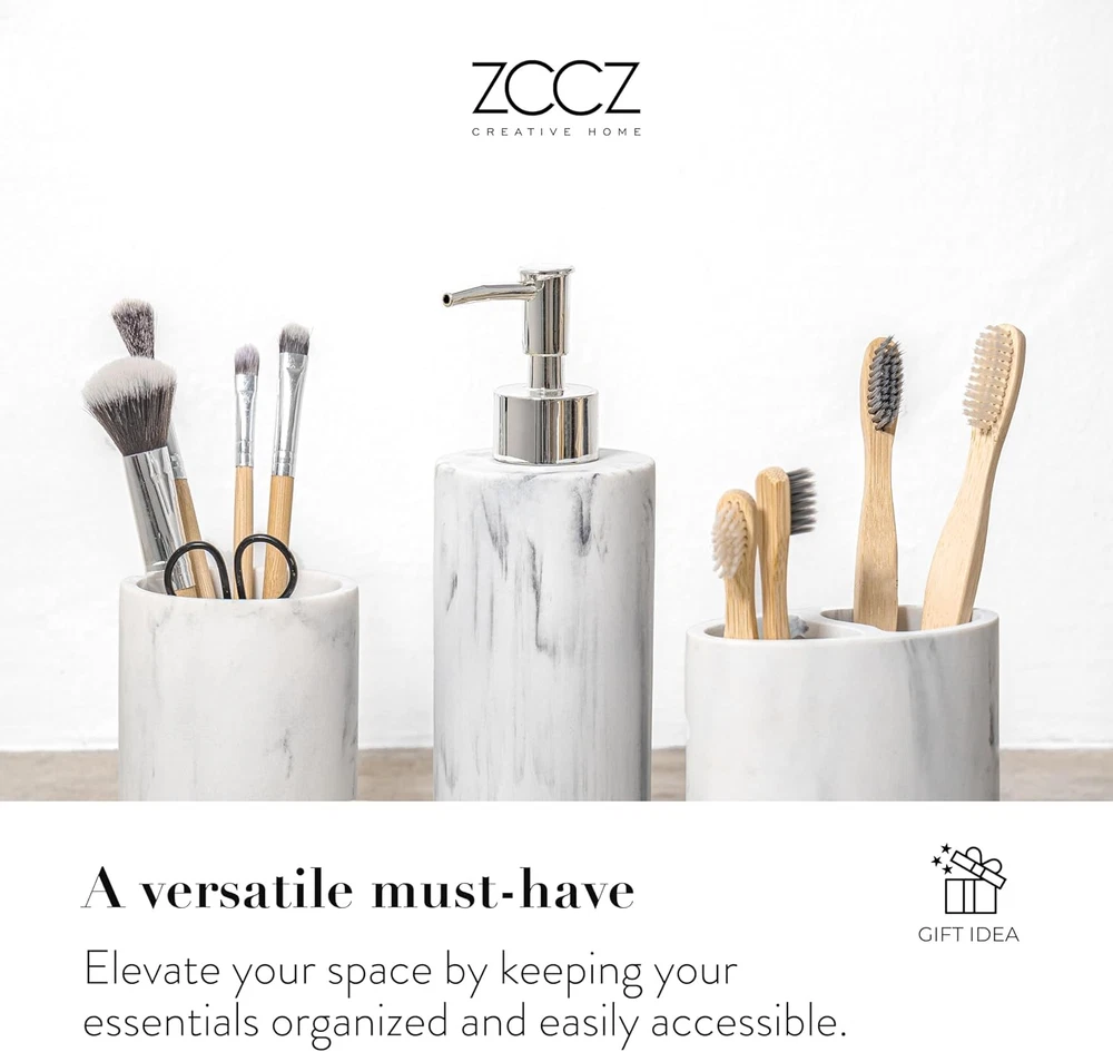 Bathroom Accessories Set 4 Piece: With 1 x soap dispenser, 1 x tooth brush holder, 1 x bathroom tumbler cup and 1 x soap dish; allow you to organize a lot of your bathroom stuff with easy and keep your bathroom clean, tidy and orderly Well Designed Bathroom Set: Classy Marble look, all of the items compliment each other. Our bathroom decor set matches your bathroom in a perfect manner Premium Material: The bathroom vanity countertop accessories set is made of nice resin material, not the brittle type of plastic or ceramics. It has that heaviness and not heavy weight marble. Pretty sturdy, the bathroom sink set won't break easily Great Gift Idea: The bathroom set accessories were well-packed to ensure that they arrived safely without damage. Perfect gift for your families, friends, lover, colleagues, housewarming or a wedding 100% Satisfaction Guarantee: Include 1 x Bathroom Accessories Set (4 piece set), 45-day money back guarantee, worry-free 18-month warranty, and friendly customer service. zccz modern bathroom accessories set, 4-piece marble pattern bath vanity accessories set with soap dispenser, toothbrush holder, tumbler and soap dish Features Nice design, classy marble look, the bathroom decorations accessories bring bright and elegant tough to your whole bathroom. Well crafted, the bathroom essential tie the colors and design together perfectly, go well with bath decor. Quality resin material, heavy and nice, the marble bathroom set doesn't break easily . A good idea to give the bathroom sets complete to your families, friends or colleagues as a gift. After Sales Your satisfaction is our goal of service. Any Problems, please do not hesitate to contact us. STEP: Your account > Your order > Purchased Items > Seller: ZCCZ > Ask a question.