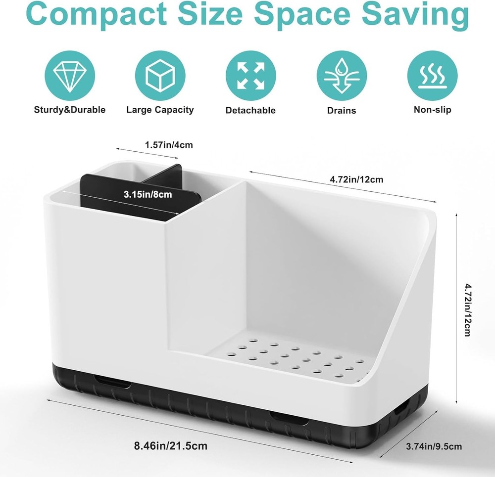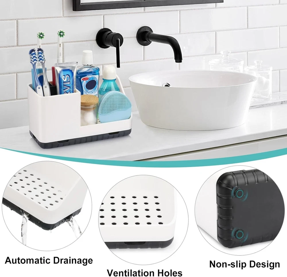 Bathroom Counter Organizer, Bathroom Organizers and Storage, Detachable Toothbrush Holders for Bathroom Vanity Sink Organizer White BATHROOM ORGANIZER: This bathroom countertop organizer features a compartmentalized design to meet your different bathroom countertop accessories. It can hold bathroom accessories such as toothbrush, toothpaste, mouthwash, razor, cosmetics and dental floss. Let you say goodbye to cluttered bathroom countertops. DRAINAGE DESIGN: The bottom of our bathroom counter organizer is made with compartment heightening design and designed with many small holes for better drainage and breathability, avoiding moisture at the bottom of electric toothbrushes, toothpaste, and other bathroom items. Well ventilated to keep your bathroom countertop dry and tidy. REMOVABLE AND EASY TO CLEAN: The bathroom organizers and storage is made with a removable partition and a removable bottom design, which makes it more convenient to clean, just remove it and wash it with water or wipe it with a damp cloth. HIGH QUALITY MATERIAL: The bathroom sink organizer countertop is made of high quality HIPS plastic. Increased thickness, no need to worry about breakage or rubber pads to prevent the toothbrush holder from falling and scratching the tabletop. MULTIFUNCTIONAL ORGANIZER: This bathroom toothbrush holder can not only be used for bathroom counter organizer, but also can be applied to bathroom, kitchen, dresser, office and other places. Keep your countertops neat and organized. Give your items a space to be stored!